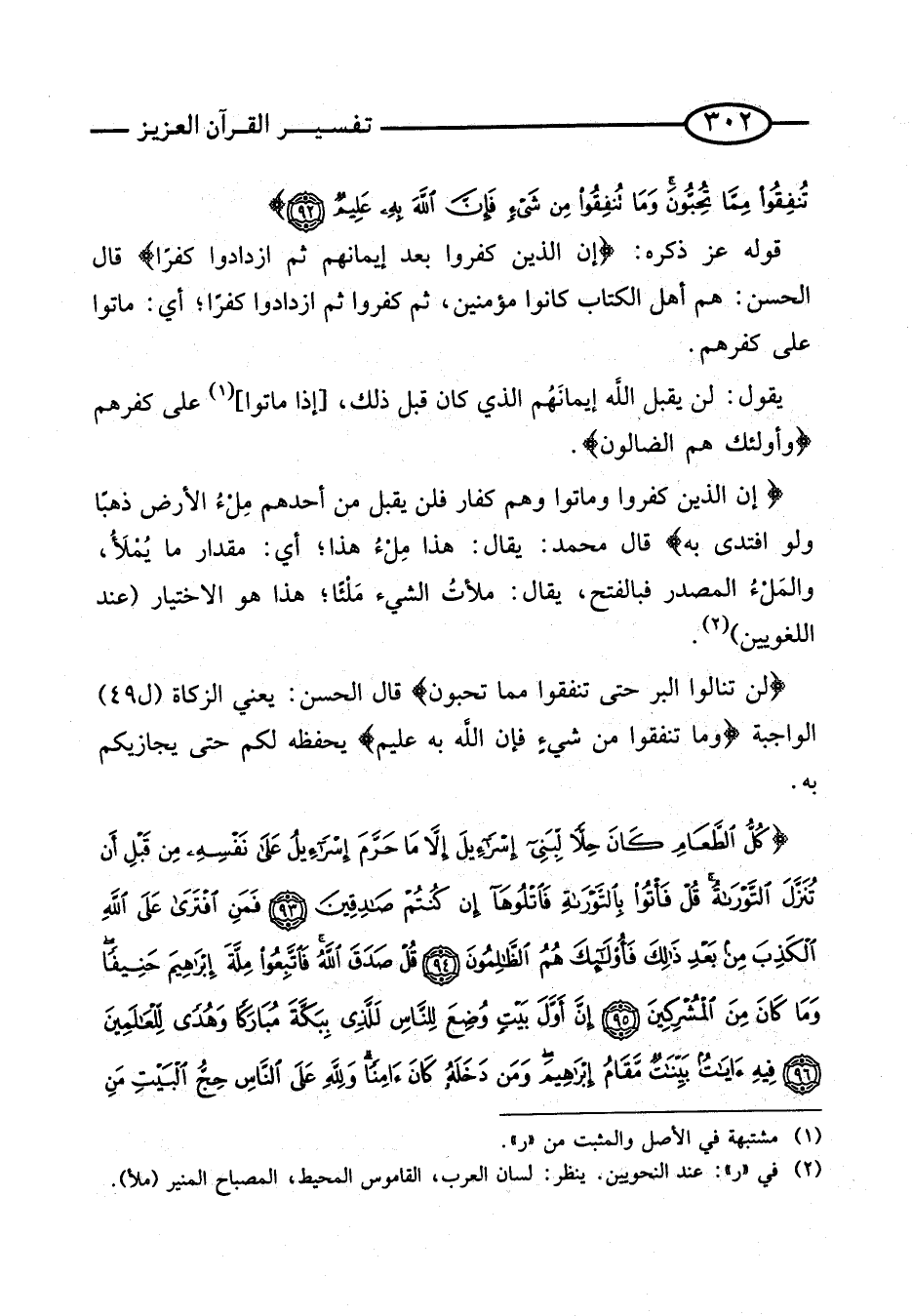 {لَنْ تَنَالُوا الْبِرَّ حَتَّى تُنْفِقُوا مِمَّا تحبون} قَالَ الْحسن: يَعْنِي الزَّكَاة (ل 49) الْوَاجِبَة {وَمَا تُنْفِقُوا مِنْ شَيْءٍ فَإِن الله بِهِ عليم} يحفظه لكم حَتَّى يجازيكم بِهِ. [آيَة 93 - 96]