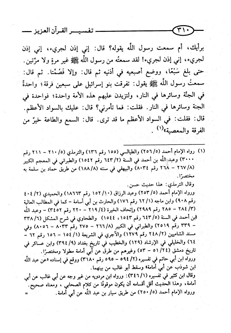 بِرَأْيِكَ، أَمْ سَمِعْتَ رَسُولَ اللَّهِ يَقُولُهُ؟ قَالَ: إِنِّي إِذَنْ لَجَرِيءٌ، إِنِّي إِذَنْ لَجَرِيءٌ، إِنِّي إِذَنْ لَجَرِيءٌ! لَقَدْ سَمِعْتُهُ مِنْ رَسُولِ اللَّهِ صَلَّى اللَّهُ عَلَيْهِ وَسَلَّمَ غير مرّة وَلَا مرَّتَيْنِ. حَتَّى بلغ سبعا، وَوضع أصبعيه فِي أُذُنَيْهِ ثمَّ قَالَ: وَإِلَّا فصمتا. ثمَّ قَالَ: سَمِعْتُ رَسُولَ اللَّهِ صَلَّى اللَّهُ عَلَيْهِ وَسَلَمَّ يَقُولُ: تَفَرَّقَتْ بَنُو إِسْرَائِيلَ عَلَى سَبْعِينَ فِرْقَةً؛ وَاحِدَةٌ فِي الْجَنَّةِ وَسَائِرُهَا فِي النَّارِ، وَلَتَزِيدَنَّ عَلَيْهِمْ هَذِهِ الأُمَّةُ وَاحِدَةً؛ فَوَاحِدَةٌ فِي الْجَنَّةِ وَسَائِرُهَا فِي النَّارِ: فَقُلْتُ: فَمَا تَأْمُرُنِي؟ قَالَ: عَلَيْكَ بِالسَّوَادِ الأَعْظَمِ. قَالَ: فَقُلْتُ: فِي السَّوَادِ الأَعْظَمِ مَا قَدْ تَرَى. قَالَ: السَّمْعُ وَالطَّاعَةُ خير من الْفرْقَة وَالْمَعْصِيَة)).