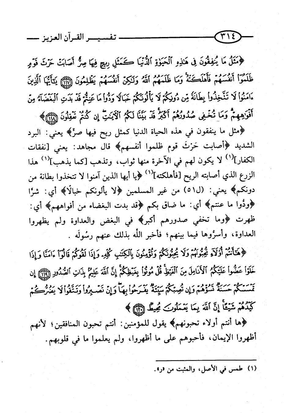 {يَا أَيهَا الَّذِينَ آمَنُوا لَا تَتَّخِذُوا بِطَانَةً من دونكم} يَعْنِي: (ل 51) من غير الْمُسلمين {لَا يَأْلُونَكُمْ خبالا} أَي: شرا {وَدُّوا مَا عَنِتُّمْ} أَي: مَا ضَاقَ بكم {قَدْ بَدَت الْبغضَاء من أَفْوَاههم} أَي: ظَهرت {وَمَا تُخْفِي صُدُورُهُمْ أكبر} فِي البغض والعداوة وَلم يظهروا الْعَدَاوَة، وأسروها فِيمَا بَينهم؛ فَأخْبر الله بذلك عَنْهُم رَسُوله. [آيَة 119 - 120]