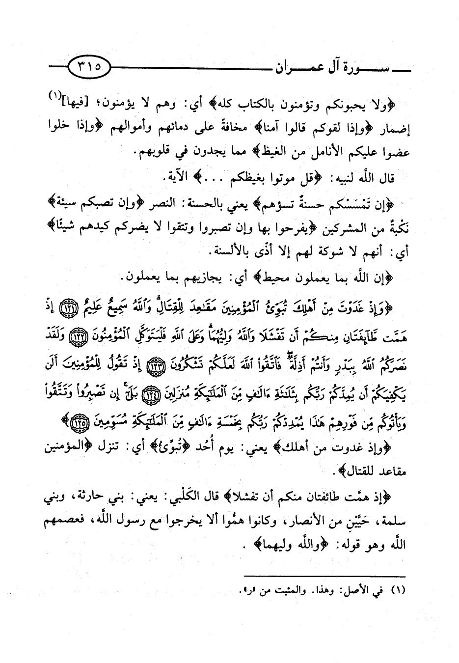 {إِن تمسسكم حَسَنَة تسؤهم} يَعْنِي بِالْحَسَنَة: النَّصْر {وَإِنْ تُصِبْكُمْ سَيِّئَة} نكبة من الْمُشْركين {يَفْرَحُوا بِهَا وَإِنْ تَصْبِرُوا وَتَتَّقُوا لَا يَضُرُّكُمْ كيدهم شَيْئا} أَي: أَنهم لَا شَوْكَة لَهُم إِلَّا أَذَى بالألسنة. {إِنَّ اللَّهَ بِمَا يعْملُونَ مُحِيط} أَي: يجازيهم بِمَا يعْملُونَ. [آيَة 121 - 125]