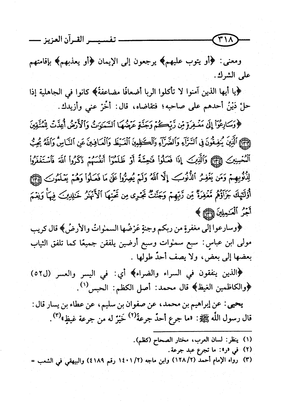 {يَا أَيهَا الَّذِينَ آمَنُوا لَا تَأْكُلُوا الرِّبَا أضعافا مضاعفة} كَانُوا فِي الْجَاهِلِيَّة إِذا حل دين أحدهم على صَاحبه؛ فتقاضاه، قَالَ: أخر عني وَأَزِيدك. [آيَة 133 - 136]