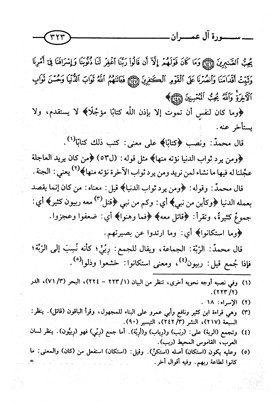 قَالَ مُحَمَّد: وَنصب {كتابا} على معنى: كتب ذَلِك كتابا. {وَمن يرد ثَوَاب الدُّنْيَا ثؤته مِنْهَا} مثل قَوْله: (ل 53) {مَنْ كَانَ يُرِيدُ الْعَاجِلَةَ عَجَّلْنَا لَهُ فِيهَا مَا نَشَاءُ لِمَنْ نُرِيد وَمَنْ يُرِدْ ثَوَابَ الآخِرَةِ نُؤْتِهِ مِنْهَا} يَعْنِي: الْجنَّة.