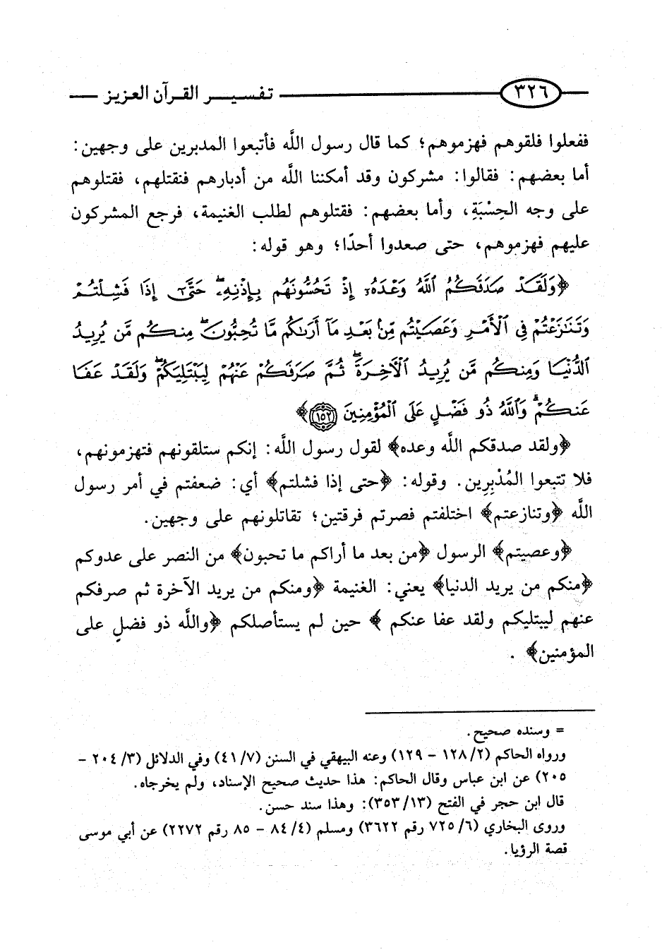 {وَلَقَد صدقكُم الله وعده} لقَوْل رَسُول الله: إِنَّكُم ستلقونهم فتهزمونهم، فَلَا تتبعوا المدبرين. وَقَوله: {حَتَّى إِذا فشلتم} أَي: ضعفتم فِي أَمر رَسُول الله {وتنازعتم} اختلفتم فصرتم فرْقَتَيْن؛ تقاتلونهم على وَجْهَيْن. {وعصيتم} الرَّسُول {مِنْ بَعْدِ مَا أَرَاكُمْ مَا تحبون} من النَّصْر على عَدوكُمْ {مِنْكُمْ من يُرِيد الدُّنْيَا} يَعْنِي: الْغَنِيمَة {وَمِنْكُمْ مَنْ يُرِيدُ الآخِرَةَ ثُمَّ صَرَفَكُمْ عَنْهُمْ لِيَبْتَلِيَكُمْ وَلَقَد عَفا عَنْكُم} حِين لم يستأصلكم {وَاللَّهُ ذُو فضل على الْمُؤمنِينَ}.
