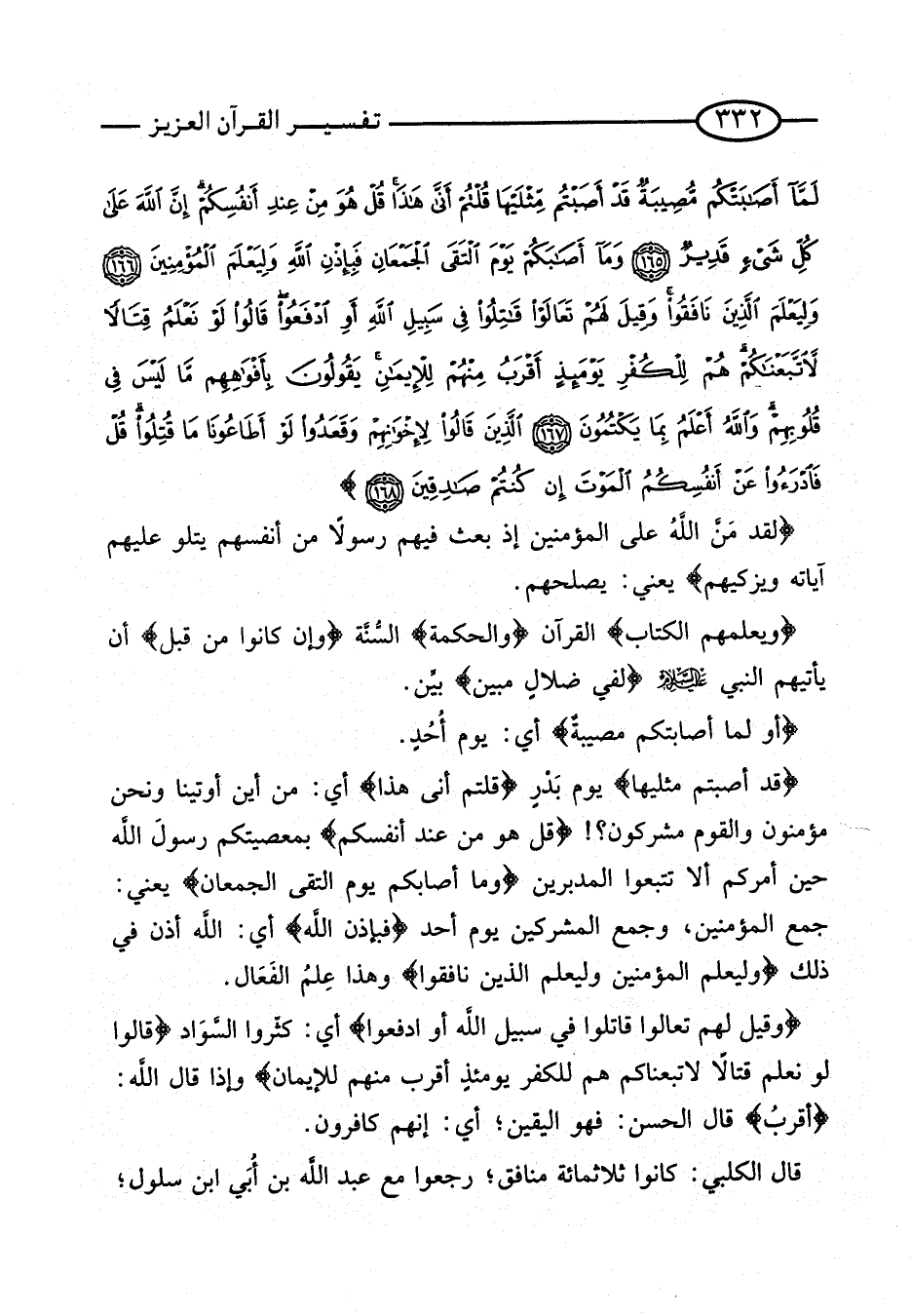 {وَمَا أَصَابَكُمْ يَوْمَ الْتَقَى الْجَمْعَانِ} يَعْنِي: جمع الْمُؤمنِينَ، وَجمع الْمُشْركين يَوْم أحد {فبإذن الله} أَي: الله أذن فِي ذَلِك {وَلِيَعْلَمَ الْمُؤْمِنِينَ وَلِيَعْلَمَ الَّذِينَ نَافَقُوا} وَهَذَا علم الفعال. {وَقِيلَ لَهُمْ تَعَالَوْا قَاتِلُوا فِي سَبِيلِ اللَّهِ أَو ادفعوا} أَي: كَثُرُوا السوَاد {قَالُوا لَوْ نَعْلَمُ قِتَالا لاتَّبَعْنَاكُمْ هُمْ لِلْكُفْرِ يَوْمئِذٍ أقرب مِنْهُم للْإيمَان} وَإِذا قَالَ الله: {أقرب} قَالَ الْحسن: فَهُوَ الْيَقِين؛ أَي: إِنَّهُم كافرون.