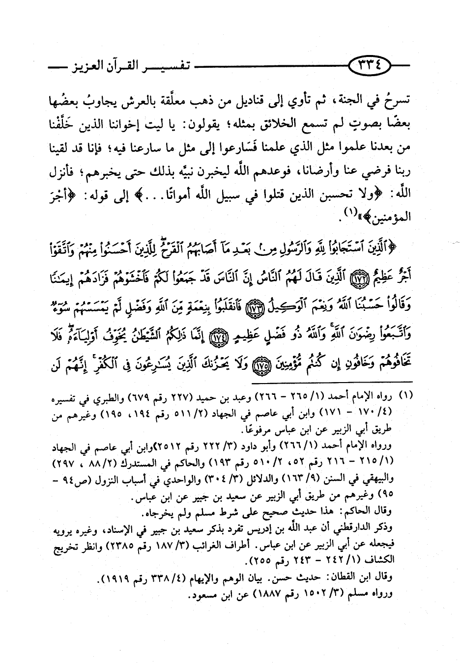 تَسْرَحُ فِي الْجَنَّةِ، ثُمَّ تَأْوِي إِلَى قَنَادِيلَ مِنْ ذَهَبٍ مُعَلَّقَةٍ بِالْعَرْشِ يُجَاوِبُ بَعْضُهَا بَعْضًا بِصَوْتٍ لَمْ تَسْمَعِ الْخَلائِقُ بِمِثْلِهِ؛ يَقُولُونَ: يَا لَيْتَ إِخْوَانَنَا الَّذِينَ خَلَّفْنَا مِنْ بَعْدِنَا عَلِمُوا مِثْلَ الَّذِي عَلِمْنَا فَسَارَعُوا إِلَى مِثْلِ مَا سَارَعْنَا فِيهِ؛ فَإِنَّا قَدْ لَقِينَا رَبَّنَا فَرَضِيَ عَنَّا وَأَرْضَانَا، فَوَعَدَهُمُ اللَّهُ لَيُخْبِرَنَّ نَبِيَّهُ بِذَلِكَ حَتَّى يُخْبِرَهُمْ؛ فَأَنْزَلَ اللَّهُ: {وَلا تَحْسَبَنَّ الَّذِينَ قُتِلُوا فِي سَبِيلِ اللَّهِ أَمْوَاتًا} إِلَى قَوْله: {أجر الْمُؤمنِينَ} [آيَة 172 - 175]