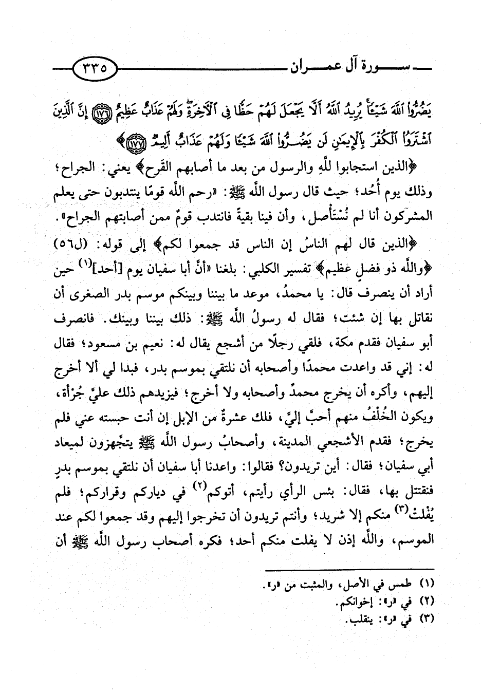 {الَّذِينَ قَالَ لَهُمُ النَّاسُ إِنَّ النَّاس قد جمعُوا لكم} إِلَى قَوْله: (ل 56) {وَالله ذُو فضل عَظِيم} تَفْسِير الْكَلْبِيّ: بلغنَا: ((أَن أَبَا سُفْيَان يَوْم [أحد] حِين أَرَادَ أَن ينْصَرف قَالَ: يَا مُحَمَّد، موعد مَا بَيْننَا وَبَيْنكُم موسم بدر الصُّغْرَى أَن نُقَاتِل بهَا إِن شِئْت؛ فَقَالَ لَهُ رَسُول اللَّهِ صَلَّى اللَّهُ عَلَيْهِ وَسَلَّمَ: ذَلِك بَيْننَا وَبَيْنك. فَانْصَرف أَبُو سُفْيَان فَقدم مَكَّة، فلقي رجلا من أَشْجَع يُقَال لَهُ: نعيم بن مَسْعُود؛ فَقَالَ لَهُ: إِنِّي قد وَاعَدت مُحَمَّدًا وَأَصْحَابه وَلَا أخرج إِلَيْهِم، وأكره أَن يخرج مُحَمَّد وَأَصْحَابه وَلَا أخرج؛ فيزيدهم ذَلِك عَليّ جرْأَة، وَيكون الْخلف مِنْهُم أحب إِلَيّ، فلك عشرَة من الْإِبِل إِن أَنْت حَبسته عني فَلم يخرج؛ فَقدم الْأَشْجَعِيّ الْمَدِينَة، وَأَصْحَاب رَسُول الله صَلَّى اللَّهُ عَلَيْهِ وَسَلَّمَ يَتَجَهَّزُونَ لميعاد أبي سُفْيَان؛ فَقَالَ: أَيْن تُرِيدُونَ؟ فَقَالُوا: واعدنا أَبَا سُفْيَان أَن نَلْتَقِي بِمَوْسِم بدر فنقتتل بهَا، فَقَالَ: بئس الرَّأْي رَأَيْتُمْ، أَتَوْكُم فِي دِيَاركُمْ وقراركم؛ فَلم يُفْلت مِنْكُم إِلَّا شريد؛ وَأَنْتُم تُرِيدُونَ أَن تخْرجُوا إِلَيْهِم وَقد جمعُوا لكم عِنْد الْمَوْسِم، وَالله إِذن لَا يفلت مِنْكُم أحد؛ فكره أَصْحَاب رَسُول اللَّهِ صَلَّى اللَّهُ عَلَيْهِ وَسَلَّمَ أَن
