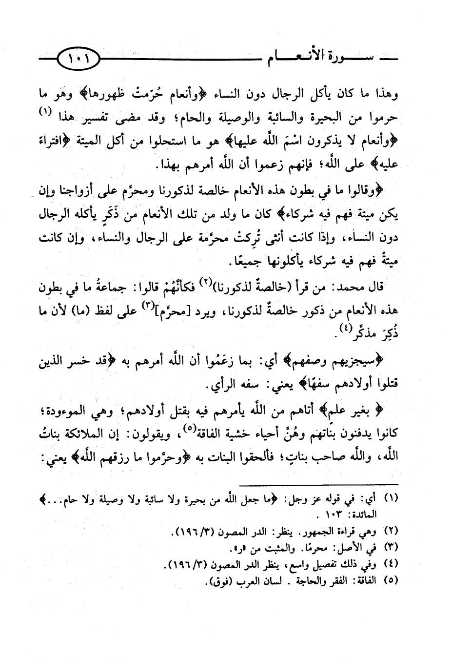 وَهَذَا مَا كَانَ يَأْكُلُ الرِّجَالُ دُونَ النِّسَاءِ {وَأَنْعَامٌ حُرِّمَتْ ظُهُورُهَا} وَهُوَ مَا حَرَّمُوا مِنَ الْبَحِيرَةِ وَالسَّائِبَةِ وَالْوَصِيلَةِ وَالْحَامِ؛ وَقَدْ مَضَى تَفْسِيرُ هَذَا {وَأَنْعَامٌ لَا يَذْكُرُونَ اسْم الله عَلَيْهَا} هُوَ مَا اسْتَحَلُّوا مِنْ أَكْلِ الْميتَة {افتراء عَلَيْهِ} عَلَى اللَّهِ؛ فَإِنَّهُمْ زَعَمُوا أَنَّ الله أَمرهم بِهَذَا.