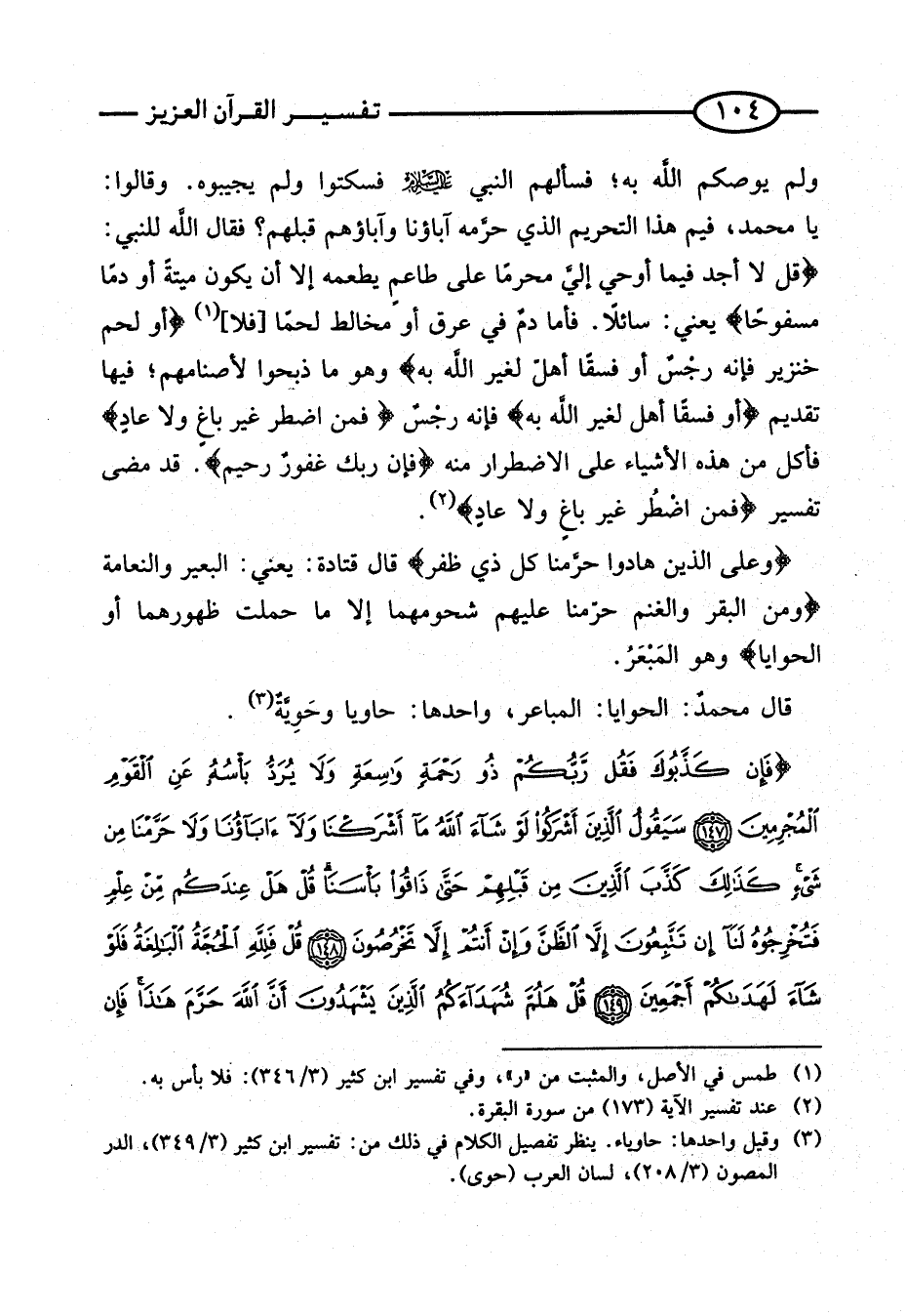 وَلَمْ يُوصِكُمُ اللَّهُ بِهِ؛ فَسَأَلَهُمُ النَّبي صَلَّى اللَّهُ عَلَيْهِ وَسَلَّمَ فَسَكَتُوا وَلَمْ يُجِيبُوهُ. وَقَالُوا: يَا مُحَمَّدُ، فِيمَ هَذَا التَّحْرِيمُ الَّذِي حَرَّمَهُ آبَاؤُنَا وَآبَاؤُهُمْ قَبْلَهُمْ؟ فَقَالَ اللَّهُ لِلنَّبِيِّ: {قُلْ لَا أَجِدُ فِيمَا أُوحِيَ إِلَيَّ مُحَرَّمًا عَلَى طَاعِمٍ يَطْعَمُهُ إِلا أَنْ يَكُونَ مَيْتَةً أَو دَمًا مسفوحا} يَعْنِي: سَائِلًا. فَأَمَّا دمٌ فِي عِرْقٍ أَوْ مُخَالِطٌ لَحْمًا [فَلَا] {أَوْ لَحْمَ خِنْزِيرٍ فَإِنَّهُ رِجْسٌ أَوْ فِسْقًا أُهِلَّ لِغَيْرِ اللَّهِ بِهِ} وَهُوَ مَا ذَبَحُوا لِأَصْنَامِهِمْ؛ فِيهَا تَقْدِيمٌ {أَوْ فِسْقًا أُهِلَّ لِغَيْرِ الله بِهِ} فَإِنَّهُ رجسٌ {فَمَنِ اضْطُرَّ غَيْرَ بَاغ وَلَا عَاد} فَأَكَلَ مِنْ هَذِهِ الْأَشْيَاءِ عَلَى الِاضْطِرَارِ مِنْهُ {فَإِنَّ رَبَّكَ غَفُورٌ رَحِيم}. قَدْ مَضَى تَفْسِيرُ {فَمَنِ اضْطُرَّ غَيْرَ بَاغٍ وَلا عَادٍ}.
