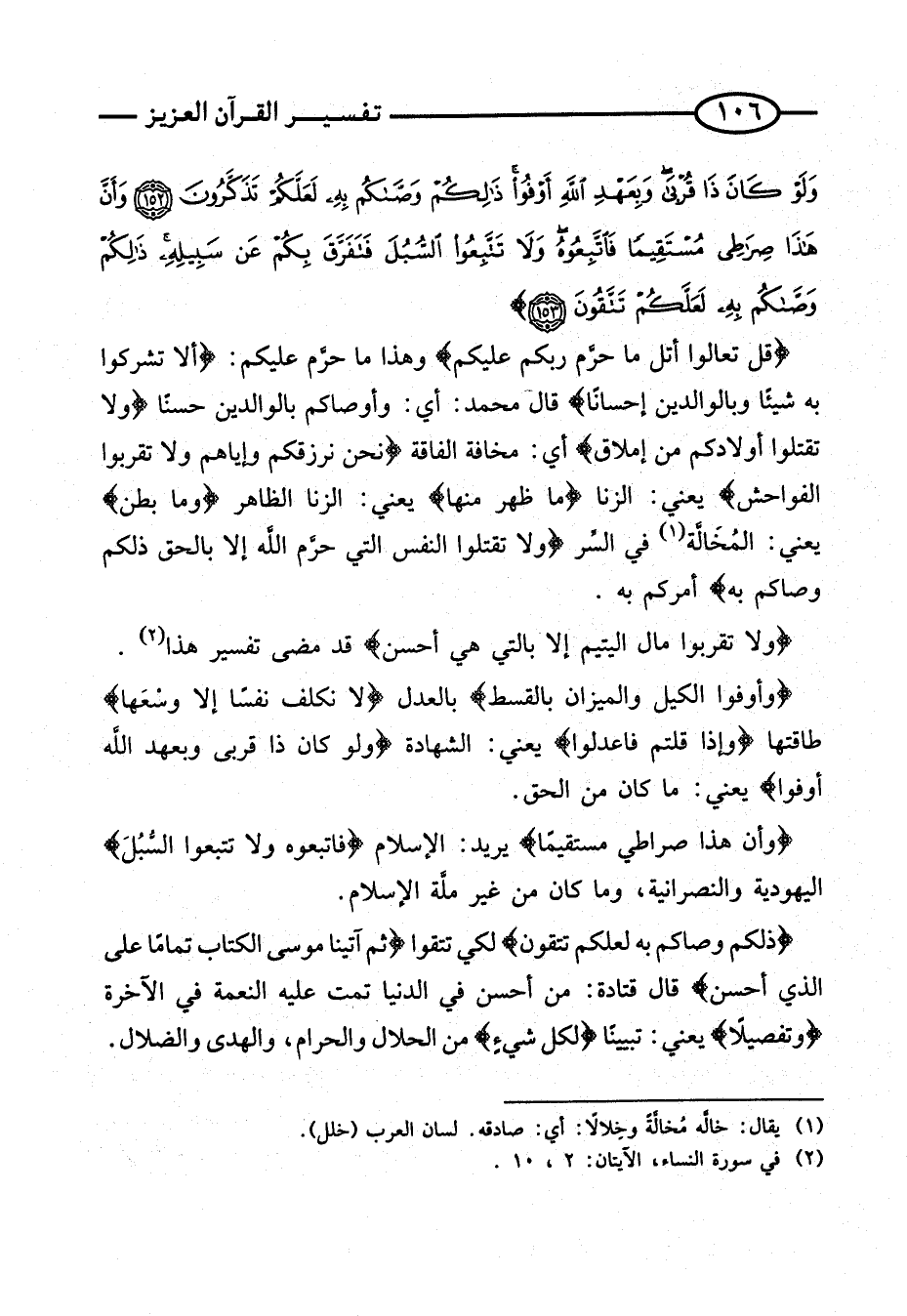 {قُلْ تَعَالَوْا أَتْلُ مَا حَرَّمَ ربكُم عَلَيْكُم} وَهَذَا مَا حَرَّمَ عَلَيْكُمْ: {أَلَّا تُشْرِكُوا بِهِ شَيْئًا وَبِالْوَالِدَيْنِ إِحْسَانًا} قَالَ مُحَمَّدٌ: أَيْ: وَأَوْصَاكُمْ بِالْوَالِدَيْنِ حُسْنًا {وَلا تَقْتُلُوا أَوْلادَكُمْ مِنْ إملاق} أَيْ: مَخَافَةَ الْفَاقَةِ {نَحْنُ نَرْزُقُكُمْ وإياهم وَلَا تقربُوا الْفَوَاحِش} يَعْنِي: الزِّنَا {مَا ظَهَرَ مِنْهَا} يَعْنِي: الزِّنَا الظَّاهِرَ {وَمَا بَطَنَ} يَعْنِي: الْمَخَالَّةَ فِي السِّرِّ {وَلا تَقْتُلُوا النَّفْسَ الَّتِي حَرَّمَ اللَّهُ إِلا بِالْحَقِّ ذَلِكُمْ وَصَّاكُمْ بِهِ} أَمركُم بِهِ.