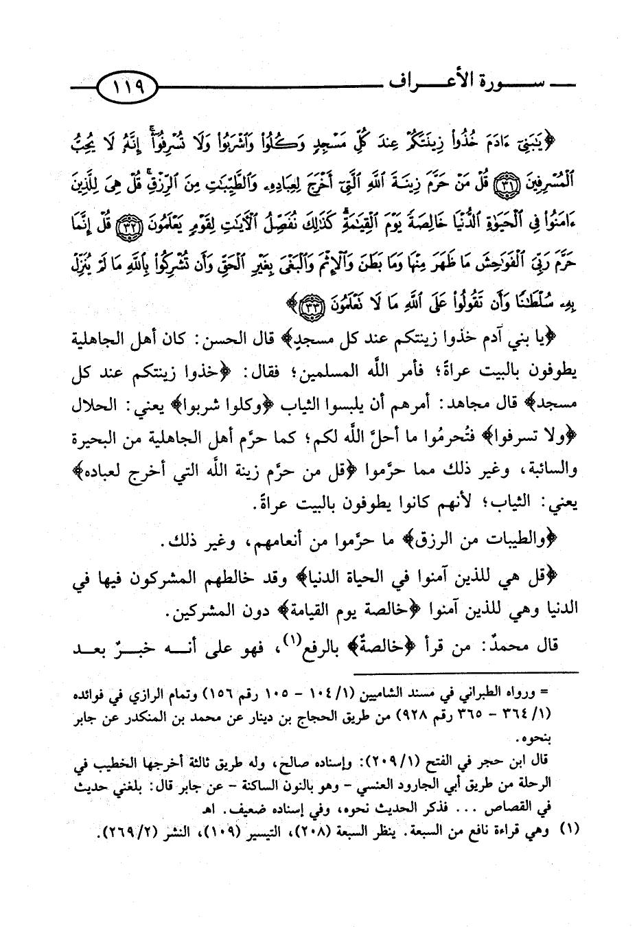 {يَا بَنِي آدَمَ خُذُوا زِينَتَكُمْ عِنْد كل مَسْجِد} قَالَ الْحَسَنُ: كَانَ أَهْلُ الْجَاهِلِيَّةِ يَطُوفُونَ بِالْبَيْتِ عُرَاةً؛ فَأَمَرَ اللَّهُ الْمُسْلِمِينَ؛ فَقَالَ: {خُذُوا زِينَتَكُمْ عِنْدَ كل مَسْجِد} قَالَ مُجَاهِدٌ: أَمَرَهُمْ أَنْ يَلْبَسُوا الثِّيَاب {وكلوا شربوا} يَعْنِي: الْحَلَال {وَلَا تسرفوا} فَتُحَرِّمُوا مَا أَحَلَّ اللَّهُ لَكُمْ؛ كَمَا حَرَّمَ أَهْلُ الْجَاهِلِيَّةِ مِنَ الْبَحِيرَةِ وَالسَّائِبَةِ، وَغَيْرُ ذَلِكَ مِمَّا حرمُوا