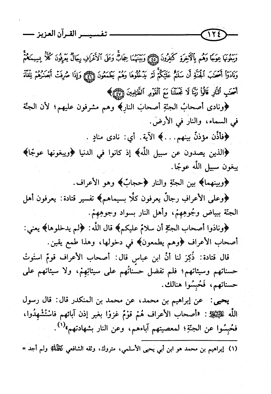 ذكر لنا أَن ابْنَ عباسٍ قَالَ: أَصْحَابُ الْأَعْرَافِ قومٌ اسْتَوَتْ حَسَنَاتُهُمْ وَسَيِّئَاتُهُمْ؛ فَلَمْ تَفْضُلْ حَسَنَاتُهُمْ عَلَى سَيِّئَاتِهِمْ، وَلَا سَيِّئَاتُهُمْ عَلَى حَسَنَاتِهِمْ، فَحُبِسُوا هُنَالِكَ.