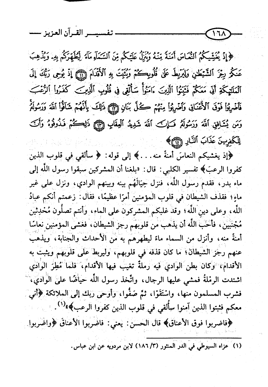 {إِذْ يُغَشِّيكُمُ النُّعَاسَ أَمَنَةً مِنْهُ} إِلَى قَوْلِهِ: {سَأُلْقِي فِي قُلُوبِ الَّذين كفرُوا الرعب} تَفْسِيرُ الْكَلْبِيِّ: قَالَ: