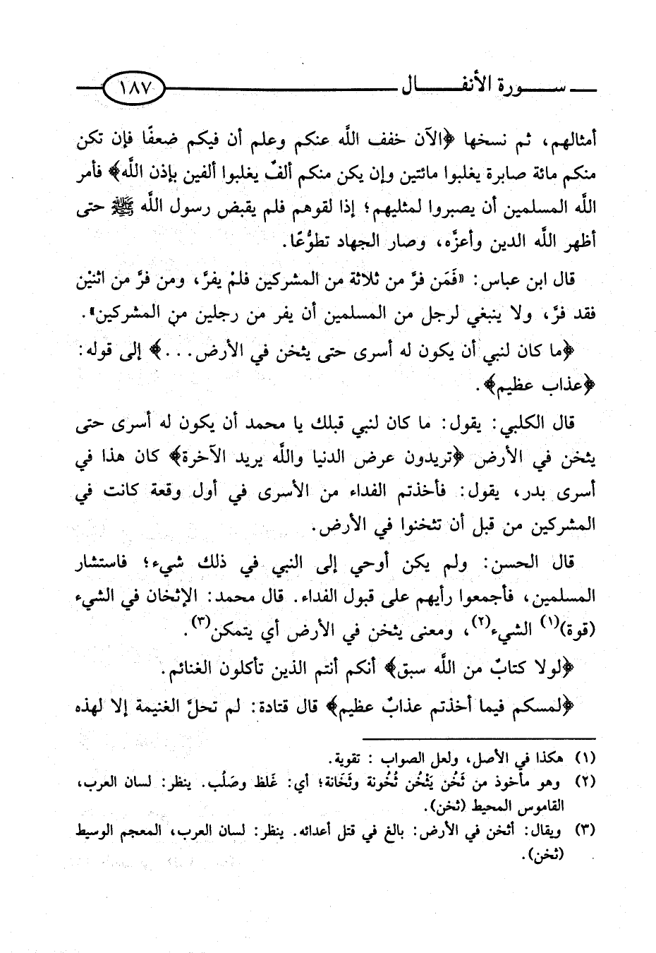 قَالَ الْحَسَنُ: وَلَمْ يَكُنْ أُوحِيَ إِلَى النَّبِيِّ فِي ذَلِكَ شَيْءٌ؛ فَاسْتَشَارَ الْمُسْلِمِينَ، فَأَجْمَعُوا رَأْيَهُمْ عَلَى قَبُولِ الْفِدَاءِ. قَالَ مُحَمَّدٌ: الإِثْخَانُ فِي الشَّيْءِ (قُوَّةُ) الشَّيْءِ، وَمَعْنَى يُثْخِنَ فِي الأَرْضِ أَي يتَمَكَّن.