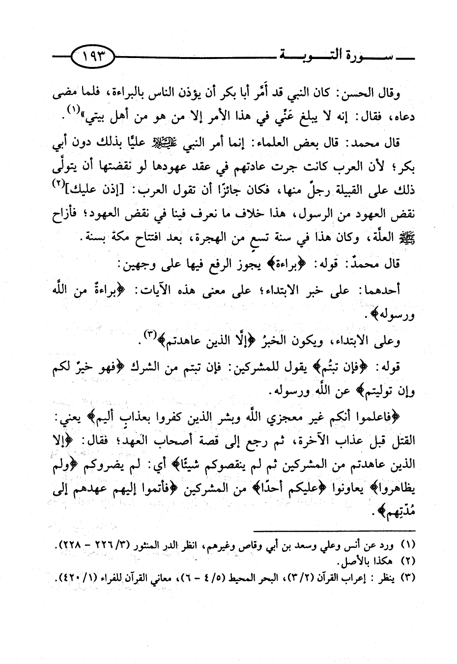 قَالَ مُحَمَّدٌ: قَوْله {بَرَاءَة} يَجُوزُ الرَّفْعُ فِيهَا عَلَى وَجْهَيْنِ: أَحَدُهُمَا: عَلَى خَبْرِ الابْتِدَاءِ؛ عَلَى مَعْنَى هَذِهِ الآيَاتُ: {بَرَاءَةٌ مِنَ الله وَرَسُوله}.