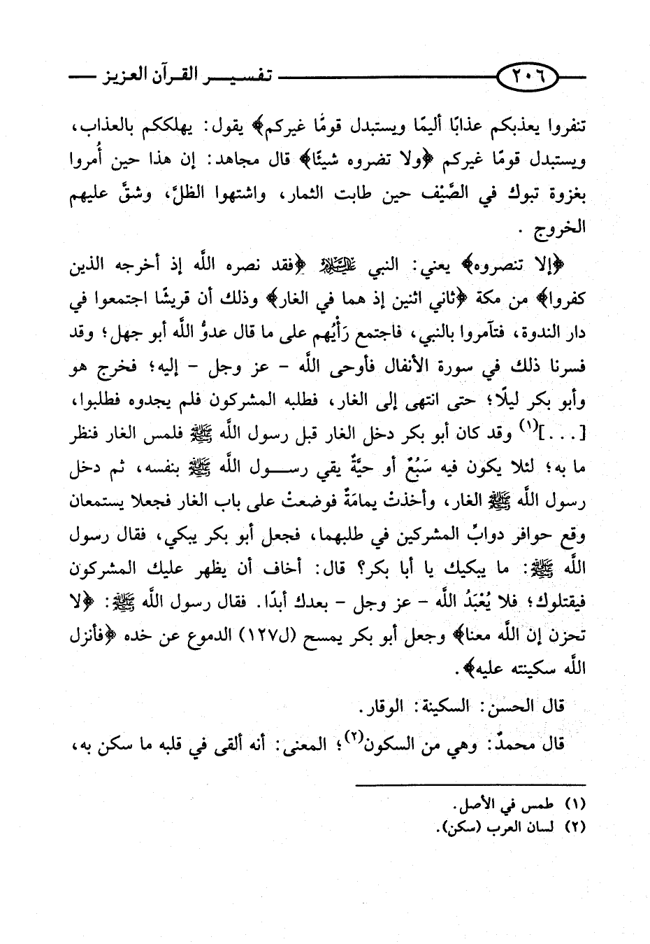 {إِلَّا تنصروه} يَعْنِي: النَّبي صَلَّى اللَّهُ عَلَيْهِ وَسلم {فَقَدْ نَصَرَهُ اللَّهُ إِذْ أَخْرَجَهُ الَّذين كفرُوا} مِنْ مَكَّةَ {ثَانِيَ اثْنَيْنِ إِذْ هما فِي الْغَار} وَذَلِكَ أَنَّ قُرَيْشًا اجْتَمَعُوا فِي دَارِ النَّدْوَةِ، فَتَآمَرُوا بِالنَّبِيِّ، فَاجْتَمَعَ رَأْيُهُمْ عَلَى مَا قَالَ عَدُوُّ اللَّهِ أَبُو جَهْلٍ؛ وَقَدْ فَسَّرْنَا ذَلِكَ فِي سُورَةِ الأَنْفَالِ فَأَوْحَى اللَّهُ - عَزَّ وَجَلَّ - إِلَيْهِ؛ فَخَرَجَ هُوَ وَأَبُو بَكْرٍ لَيْلا؛ حَتَّى انْتَهَى إِلَى الْغَارِ، فَطَلَبَهُ الْمُشْرِكُونَ فَلَمْ يَجِدُوهُ فَطَلَبُوا، [ ... ] وَقَدْ كَانَ أَبُو بَكْرٍ دَخَلَ الْغَارَ قَبْلَ رَسُولَ اللَّهِ صَلَّى اللَّهُ عَلَيْهِ وَسَلَّمَ فَلَمَسَ الْغَارَ فَنَظَرَ مَا بِهِ؛ لِئَلا يَكُونُ فِيهِ سبعٌ أَوْ حيةٌ يَقِي رَسُولَ اللَّهِ صَلَّى اللَّهُ عَلَيْهِ وَسَلَّمَ بِنَفْسِهِ، ثُمَّ دَخَلَ رَسُولُ اللَّهِ صَلَّى اللَّهُ عَلَيْهِ وَسَلَّمَ الْغَارَ، وَأَخَذَتْ يمامةٌ فَوَضَعَتْ عَلَى بَابِ الْغَارِ فَجَعَلا يَسْتَمِعَانِ وَقْعَ حَوَافِرِ دَوَابِّ الْمُشْرِكِينَ فِي طَلَبِهِمَا، فَجَعَلَ أَبُو بَكْرٍ يَبْكِي، فَقَالَ رَسُولُ اللَّهِ صَلَّى اللَّهُ عَلَيْهِ وَسَلَّمَ: " مَا يُبْكِيكَ يَا أَبَا بَكْرٍ؟ قَالَ: أَخَافُ أَنْ يَظْهَرَ عَلَيْكَ الْمُشْرِكُونَ فَيَقْتُلُوكَ؛ فَلا يُعْبَدُ اللَّهُ - عَزَّ وَجَلَّ - بَعْدَكَ أَبَدًا. فَقَالَ رَسُولُ اللَّهِ صَلَّى اللَّهُ عَلَيْهِ وَسَلَّمَ: {لَا تَحْزَنْ إِنَّ اللَّهَ مَعَنَا} وَجعل أَبُو بكر يمسح (ل 127) الدُّمُوعَ عَنْ خَدِّهِ {فَأَنْزَلَ اللَّهُ سكينته عَلَيْهِ}.