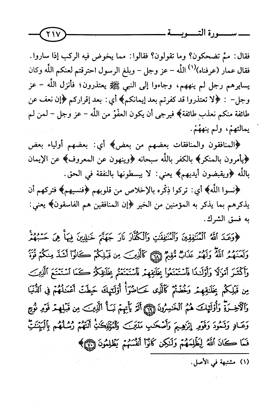 فَقَالَ عمار (عَرفْنَاهُ) اللَّهُ - عَزَّ وَجَلَّ - وَبَلَّغَ الرَّسُولَ احْتَرَقْتُمْ لَعَنَكُمُ اللَّهُ وَكَانَ يُسَايِرُهُمْ رَجُلٌ لَمْ يَنْهَهُمْ، وَجَاءُوا إِلَى النَّبي صَلَّى اللَّهُ عَلَيْهِ وَسَلَّمَ يَعْتَذِرُونَ؛ فَأَنْزَلَ اللَّهُ - عَزَّ وَجَلَّ -: {لَا تَعْتَذِرُوا قَدْ كَفَرْتُمْ بَعْدَ إيمَانكُمْ} أَيْ: بَعْدَ إِقْرَارِكُمْ {إِنْ نَعْفُ عَنْ طَائِفَةٍ مِنْكُمْ نُعَذِّبْ طَائِفَةً} فَيُرْجَى أَنْ يَكُونَ الْعَفْوُ مِنَ اللَّهِ - عَزَّ وَجَلَّ - لِمَنْ لَمْ يمالئهم، وَلم ينههم.
