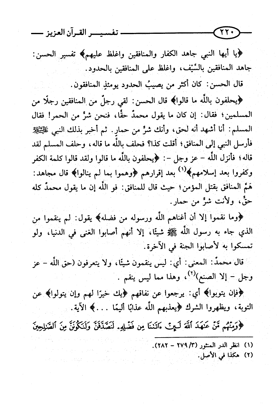 {يَا أَيهَا النَّبِيُّ جَاهِدِ الْكُفَّارَ وَالْمُنَافِقِينَ وَاغْلُظْ عَلَيْهِم} تَفْسِيرُ الْحَسَنِ: جَاهِدِ الْمُنَافِقِينَ بِالسَّيْفِ، وَاغْلُظْ عَلَى الْمُنَافِقِينَ بِالْحُدُودِ.