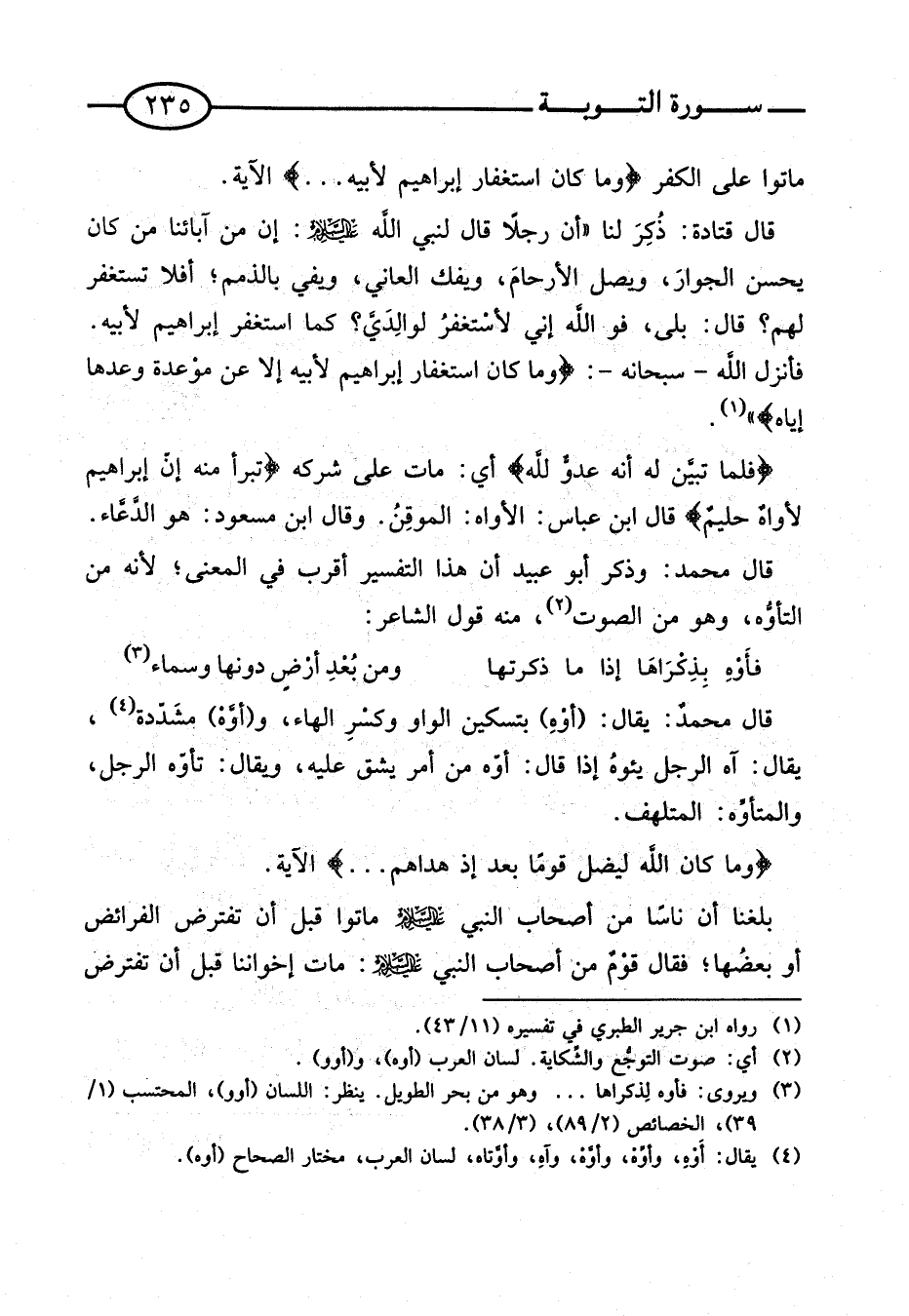 {فَلَمَّا تَبَيَّنَ لَهُ أَنه عَدو لله} أَيْ: مَاتَ عَلَى شِرْكِهِ {تَبَرَّأَ مِنْهُ إِنَّ إِبْرَاهِيمَ لأَوَّاهٌ حَلِيمٌ} قَالَ ابْنُ عَبَّاسٍ: الأَوَّاهُ: الْمُوقِنُ. وَقَالَ ابْنُ مَسْعُودٍ: هُوَ الدَّعَّاءُ.