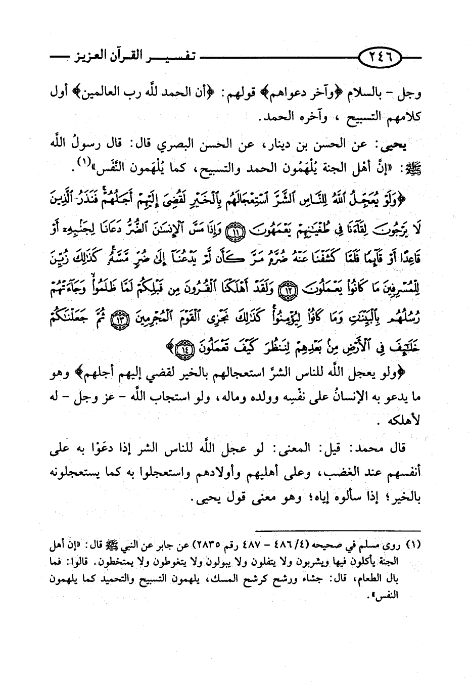 قَالَ مُحَمَّدٌ: قِيلَ: الْمَعْنَى: لَوْ عَجَّلَ اللَّهُ لِلنَّاسِ الشَّرَّ إِذَا دَعَوْا بِهِ عَلَى أَنْفُسِهِمْ عِنْدَ الْغَضَبِ، وَعَلَى أَهْلِيهِمْ وَأَوْلادِهِمْ وَاسْتَعْجَلُوا بِهِ كَمَا يَسْتَعْجِلُونَهُ بِالْخَيْرِ؛ إِذَا سَأَلُوهُ إِيَّاهُ؛ وَهُوَ مَعْنَى قَول يحيى.