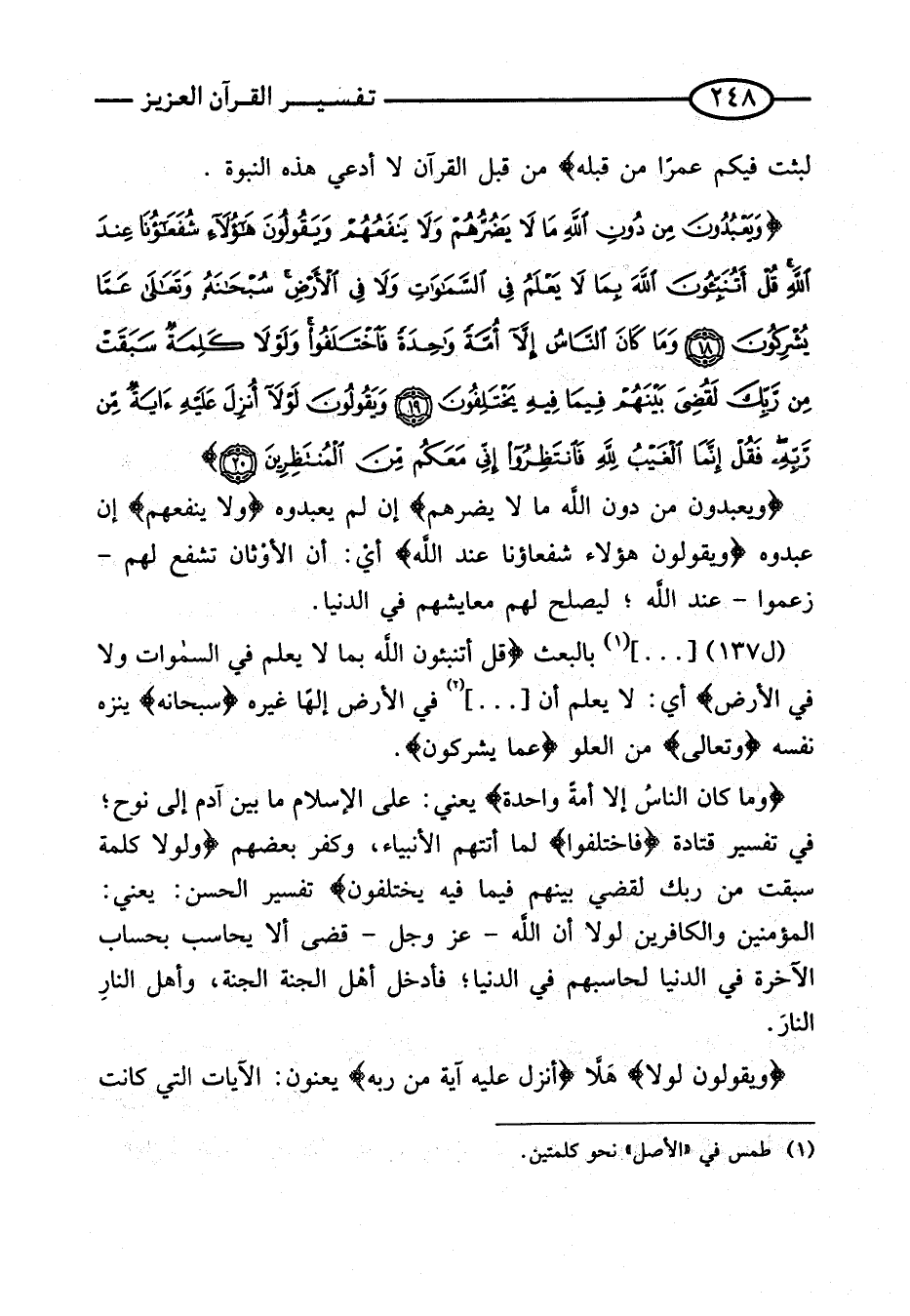 {وَمَا كَانَ النَّاسُ إِلا أُمَّةً وَاحِدَة} يَعْنِي: عَلَى الإِسْلامَ مَا بَيْنَ آدَمَ إِلَى نُوحٍ؛ فِي تَفْسِيرِ قَتَادَة {فَاخْتَلَفُوا} لَمَّا أَتَتْهُمُ الأَنْبِيَاءُ، وَكَفَرَ بَعْضُهُمْ {وَلَوْلا كَلِمَةٌ سَبَقَتْ مِنْ رَبِّكَ لَقُضِيَ بَيْنَهُمْ فِيمَا فِيهِ يَخْتَلِفُونَ} تَفْسِيرُ الْحَسَنِ: يَعْنِي: الْمُؤْمِنِينَ وَالْكَافِرِينَ لَوْلا أَنَّ اللَّهَ - عَزَّ وَجَلَّ - قَضَى أَلا يُحَاسِبَ بِحِسَابِ الآخِرَةِ فِي الدُّنْيَا لحاسبهم فِي الدُّنْيَا؛ فَأَدْخَلَ أَهْلَ الْجَنَّةِ الْجنَّة، وَأهل النَّار النَّار.