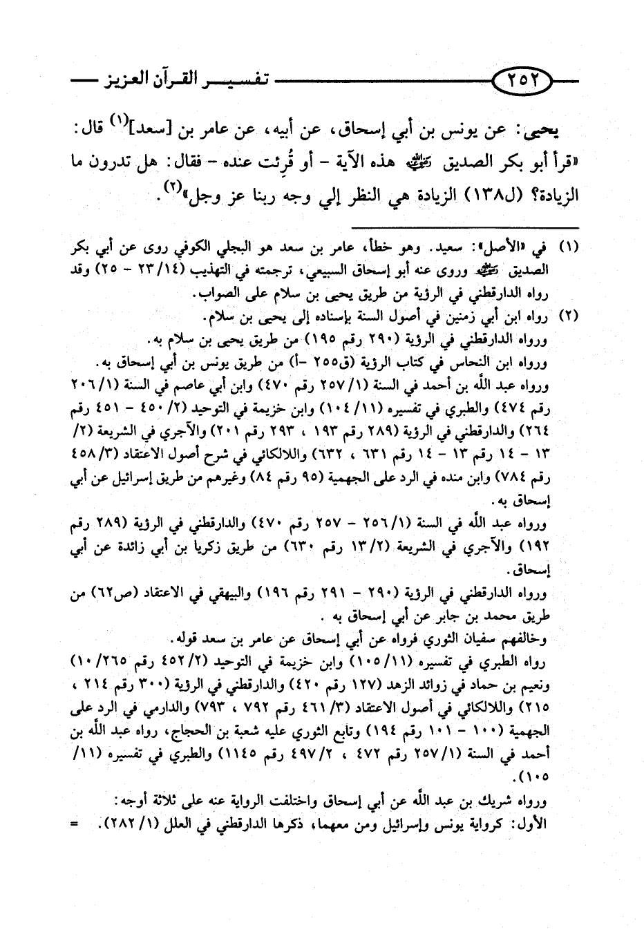 قَرَأَ أَبُو بكر الصّديق رَضِيَ اللَّهُ عَنْهُ هَذِهِ الآيَةَ - أَوْ قُرِئَتْ عِنْدَهُ - فَقَالَ: هَلْ تَدْرُونَ مَا الزِّيَادَة؟ (ل 138) الزِّيَادَةُ هِيَ النَّظَرُ إِلَى وَجْهِ رَبِّنَا عَزَّ وَجَلَّ ".