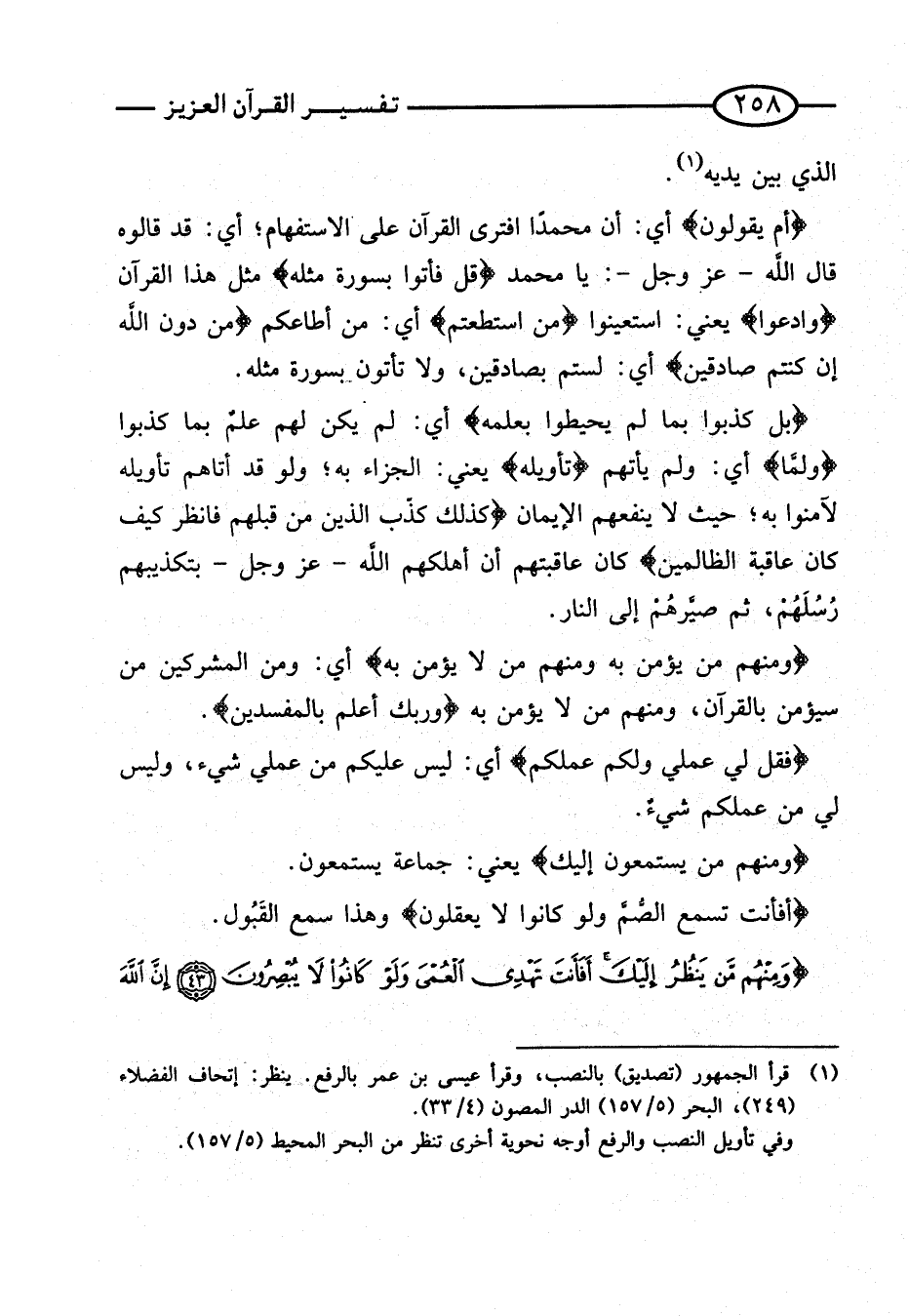 {أم يَقُولُونَ} أَيْ: أَنَّ مُحَمَّدًا افْتَرَى الْقُرْآنَ عَلَى الاسْتِفْهَامِ؛ أَيْ: قَدْ قَالُوهُ قَالَ اللَّهُ - عَزَّ وَجَلَّ -: يَا مُحَمَّدُ {قُلْ فَأْتُوا بِسُورَةٍ مِثْلِهِ} مثل هَذَا الْقُرْآن {وَادعوا} يَعْنِي: اسْتَعِينُوا {من اسْتَطَعْتُم} أَيْ: مَنْ أَطَاعَكُمْ {مِنْ دُونِ الله إِن كُنْتُم صَادِقين} أَيْ: لَسْتُمْ بِصَادِقِينَ، وَلا تَأْتُونَ بِسُورَة مثله.
