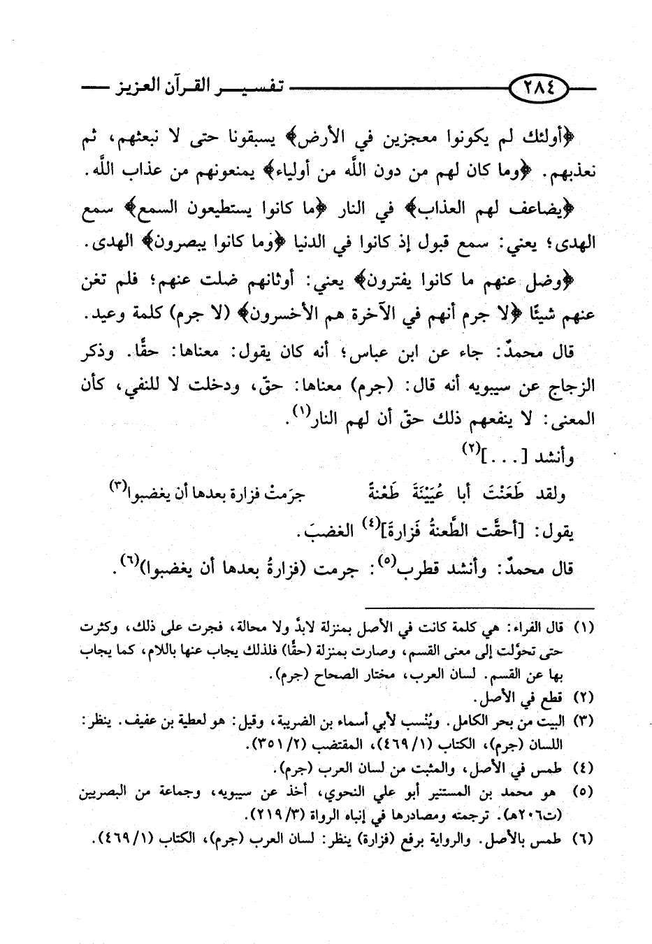 قَالَ محمدٌ: جَاءَ عَنِ ابْن عَبَّاس؛ أَنَّهُ كَانَ يَقُولُ: مَعْنَاهَا: حَقًّا. وَذَكَرَ الزَّجَّاجُ عَنْ سِيبَوَيْهِ أَنَّهُ قَالَ: (جَرَمَ) مَعْنَاهَا: حَقٌّ، وَدَخَلَتْ لَا لِلنَّفْيِ، كَأَنَّ الْمَعْنَى: لَا يَنْفُعُهُمْ ذَلِكَ حَقٌّ أَنَّ لَهُمُ النَّارَ.