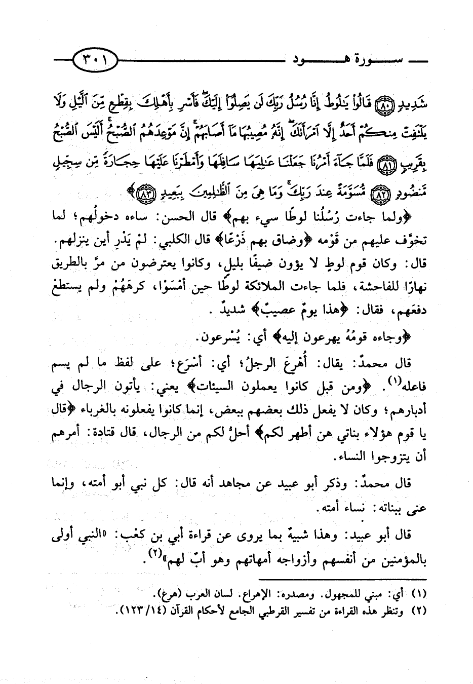 قَالَ محمدٌ: يُقَالُ: أُهْرِعَ الرَّجُلُ؛ أَيْ: أَسْرَعَ؛ عَلَى لَفْظِ مَا لَمْ يُسَمَّ فَاعِلُهُ. {وَمِنْ قَبْلُ كَانُوا يَعْمَلُونَ السَّيِّئَاتِ} يَعْنِي: يَأْتُونَ الرِّجَالَ فِي أَدْبَارِهِمْ؛ وَكَانَ لَا يَفْعَلُ ذَلِكَ بَعْضُهُمْ بِبَعْضٍ، إِنَّمَا كَانُوا يَفْعَلُونَهُ بِالْغُرَبَاءِ {قَالَ يَا قَوْمِ هَؤُلاءِ بَنَاتِي هن أطهر لكم} أَحَلُّ لَكُمْ مِنَ الرِّجَالِ، قَالَ قَتَادَةُ: أَمَرَهُمْ أَنْ يَتَزَوَّجُوا النِّسَاءَ.