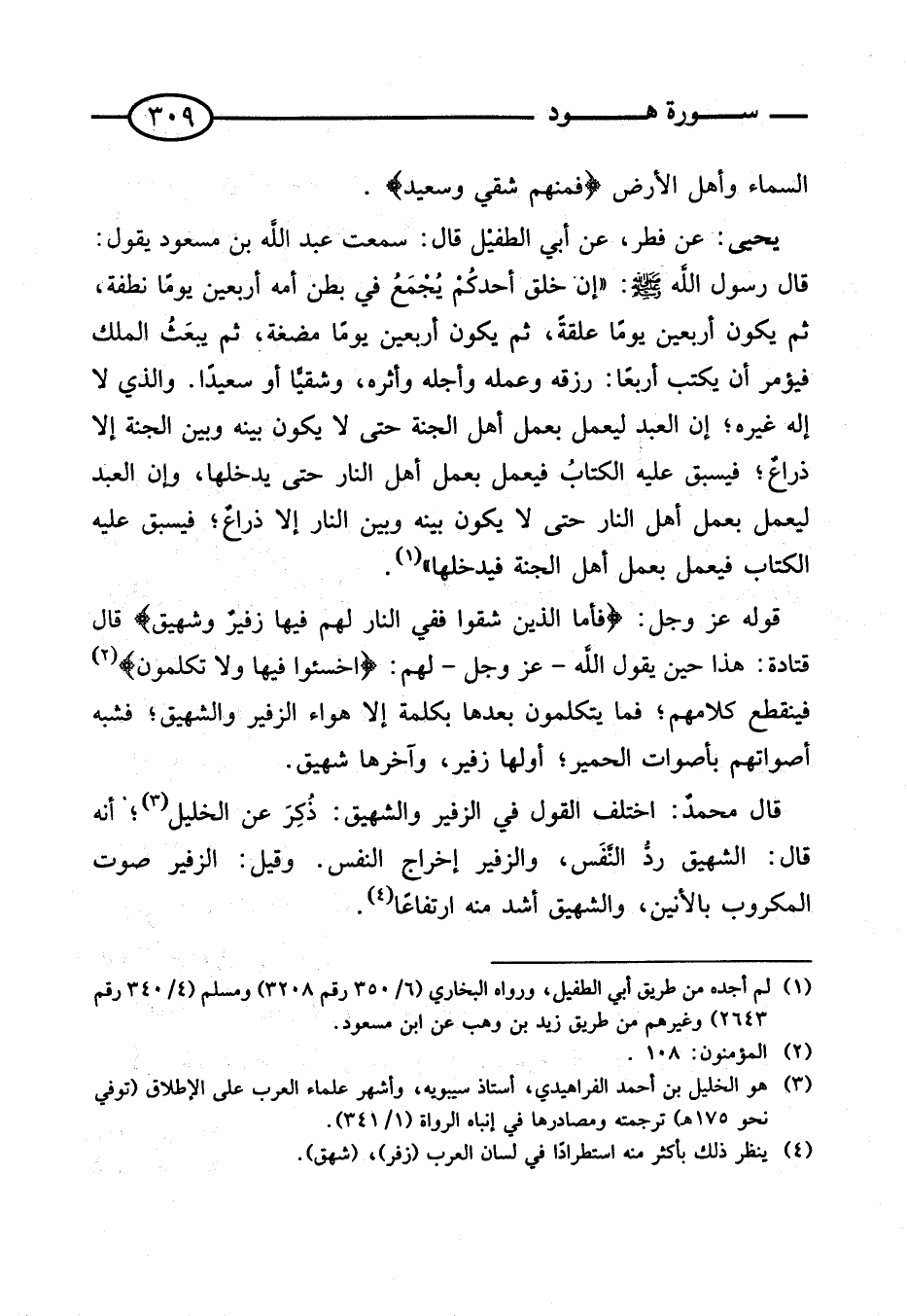 قَالَ محمدٌ: اخْتَلَفَ الْقَوْلُ فِي الزَّفِيرِ وَالشَّهِيقِ: ذُكِرَ عَنِ الْخَلِيلِ؛ أَنَّهُ قَالَ: