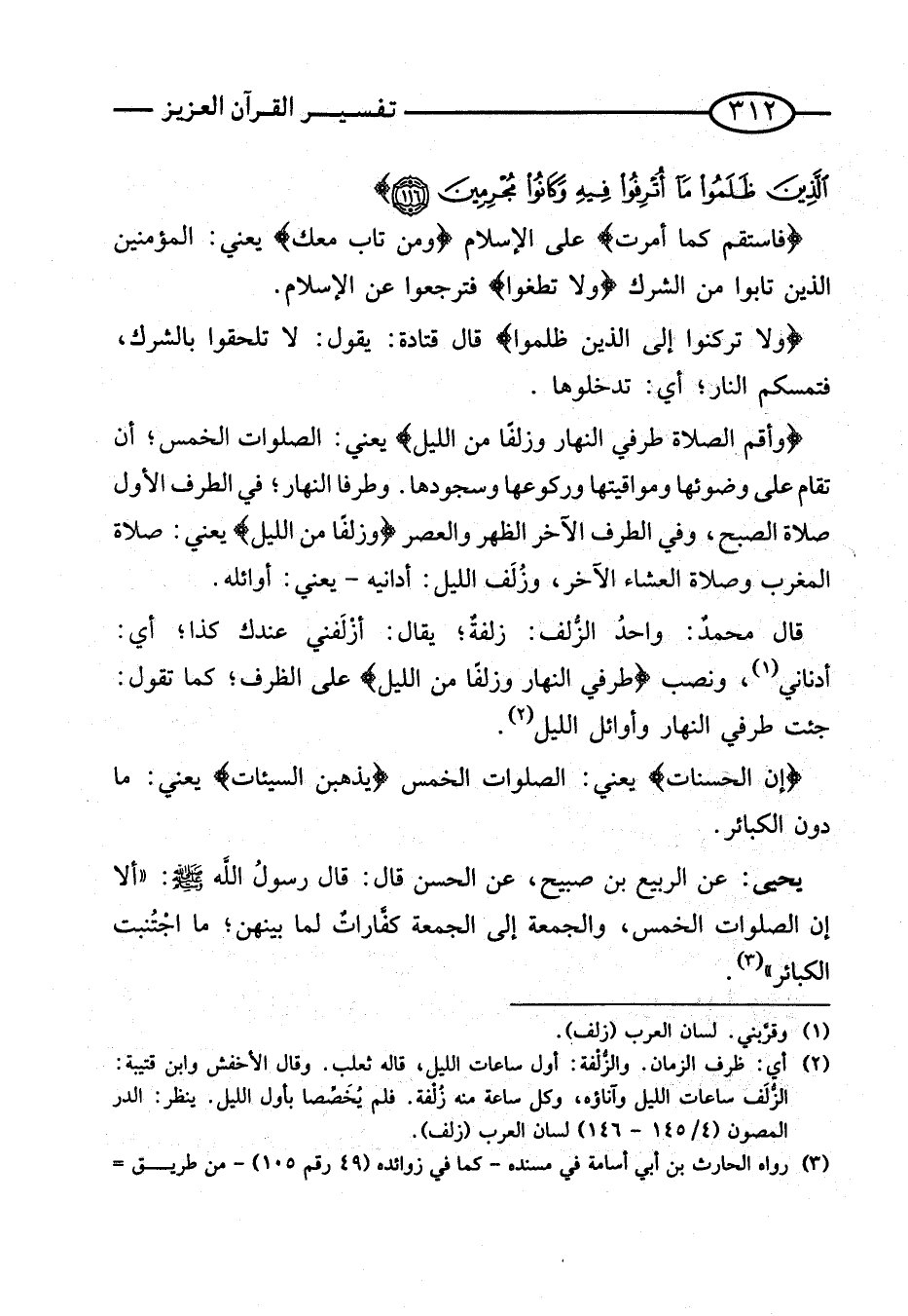 {وَأَقِمِ الصَّلاةَ طَرَفَيِ النَّهَارِ وَزُلَفًا من اللَّيْل} يَعْنِي: الصَّلَوَاتِ الْخَمْسَ: أَنْ تُقَامَ عَلَى وضوئها ومواقيتها وركوعها وسجودها. وَطَرَفَا النَّهَارِ؛ فِي الطَّرَفِ الأَوَّلِ صَلاةُ الصُّبْحِ، وَفِي الطَّرَفِ الآخَرِ الظُّهْرُ وَالْعَصْرُ {وَزُلَفًا مِنَ اللَّيْلِ} يَعْنِي: صَلاةَ الْمَغْرِبِ وَصَلاةَ الْعِشَاءِ الآخِرِ، وَزُلَفَ اللَّيْلِ: أَدَانِيهِ - يَعْنِي: أَوَائِلَهُ.