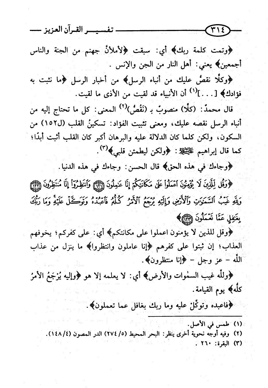 قَالَ محمدٌ: (كلاًّ) منصوبٌ ب (نقص) الْمَعْنَى: كُلُّ مَا تَحْتَاجُ إِلَيْهِ مِنْ أَنْبَاءِ الرُّسُلِ نَقُصُّهُ عَلَيْكَ، وَمَعْنَى تَثْبِيتِ الْفُؤَادِ: تَسْكِينُ الْقَلْبِ (ل 152) مِنَ السُّكُونِ، وَلَكِنْ كُلَّمَا كَانَ الدَّلالَةُ عَلَيْهِ وَالْبُرْهَانُ أَكْبَرَ كَانَ الْقَلْبُ أَثْبَتَ أَبَدًا؛ كَمَا قَالَ إِبْرَاهِيمُ عَلَيْهِ السَّلامُ: {وَلَكِنْ لِيَطْمَئِنَّ قلبِي}.