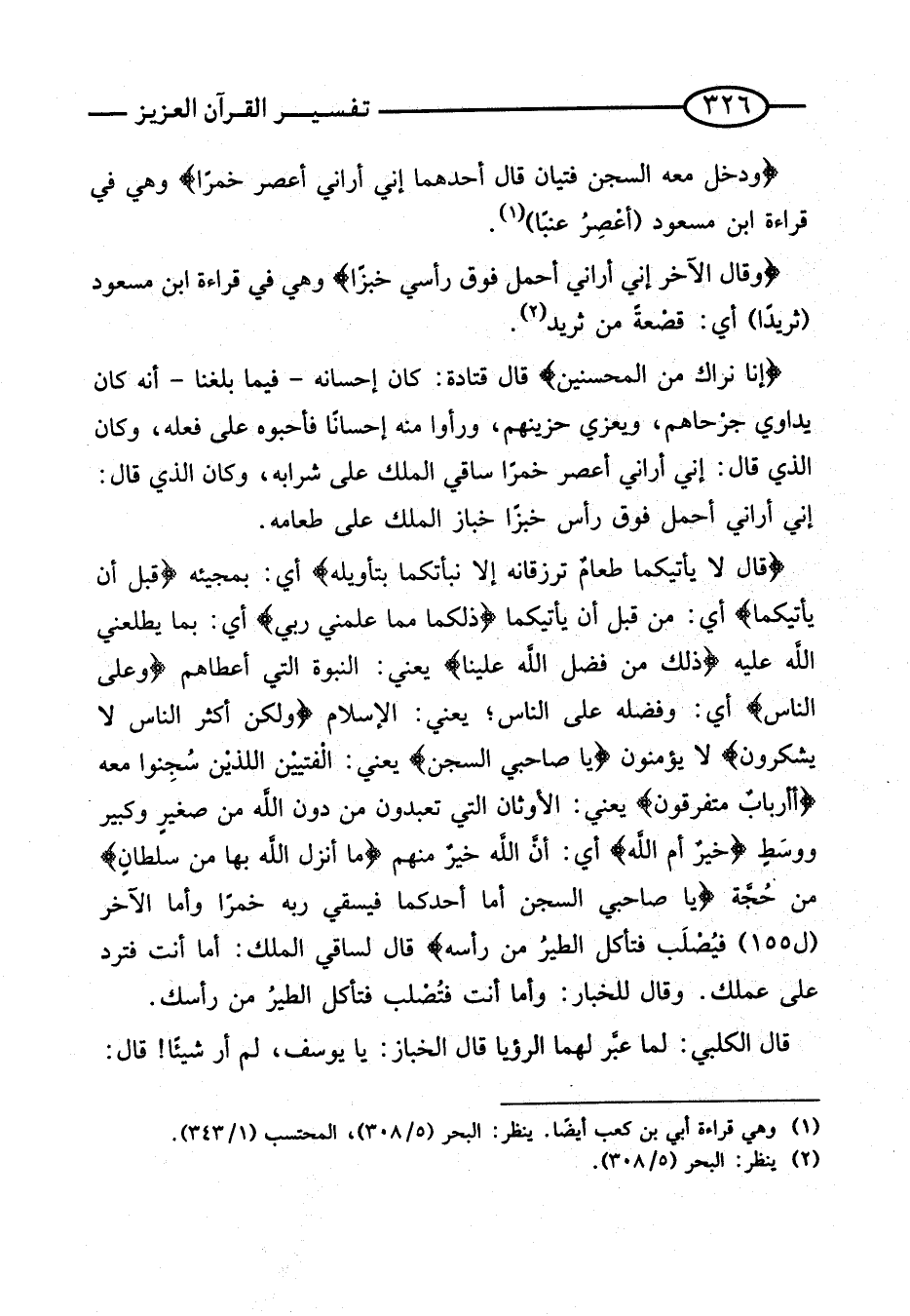 {يَا صَاحِبَيِ السِّجْنِ أَمَّا أَحَدُكُمَا فَيَسْقِي رَبَّهُ خَمْرًا وَأَمَّا الآخَرُ (ل 155} فَيُصْلَبُ فَتَأْكُلُ الطَّيْرُ مِنْ رَأْسِهِ} قَالَ لِسَاقِي الْمَلِكِ: أَمَّا أَنْتَ فَترد على عَمَلك. وَقَالَ للخبار: وَأَمَّا أَنْتَ فَتُصْلَبُ فَتَأْكُلُ الطَّيْرُ مِنْ رَأْسِكَ.