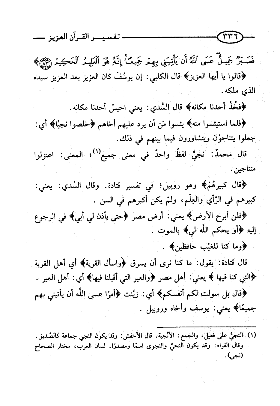 {فَلَمَّا استيئسوا مِنْهُ} يَئِسُوا مِنْ أَنْ يَرُدَّ عَلَيْهِمْ أَخَاهُم {خلصوا نجيا} أَيْ: جَعَلُوا يَتَنَاجَوْنَ وَيَتَشَاوَرُونَ فِيمَا بَيْنَهُمْ فِي ذَلِكَ.