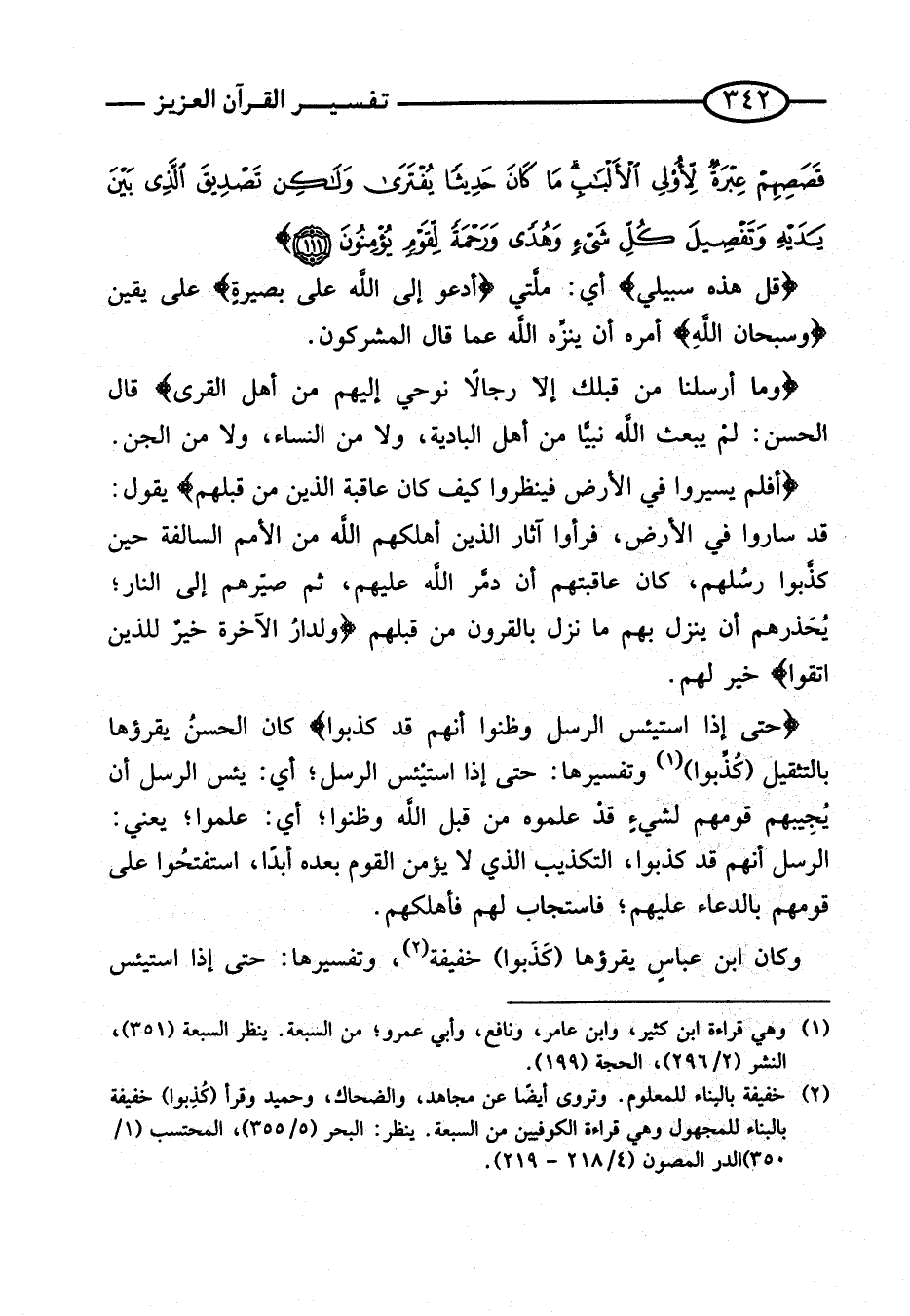 {حَتَّى إِذا استيئس الرُّسُلُ وَظَنُّوا أَنَّهُمْ قَدْ كُذِبُوا} كَانَ الْحَسَنُ يَقْرَؤُهَا بِالتَّثْقِيلِ (كُذِّبُوا) وَتَفْسِيرُهَا: حَتَّى إِذَا اسْتَيْئَسَ الرُّسُلُ؛ أَيْ: يَئِسَ الرُّسُلُ أَنْ يُجِيبَهُمْ قَوْمُهُمْ لشيءٍ قَدْ عَلِمُوهُ مِنْ قِبَلِ اللَّهِ وَظَنُّوا؛ أَيْ: عَلِمُوا؛ يَعْنِي: الرُّسُلَ أَنَّهُمْ قَدْ كُذِبُوا، التَّكْذِيبُ الَّذِي لَا يُؤْمِنُ الْقَوْمُ بَعْدَهُ أَبَدًا، اسْتَفْتَحُوا عَلَى قَوْمِهِمْ بِالدُّعَاءِ عَلَيْهِمْ؛ فَاسْتَجَابَ لَهُمْ فَأَهْلَكَهُمْ.