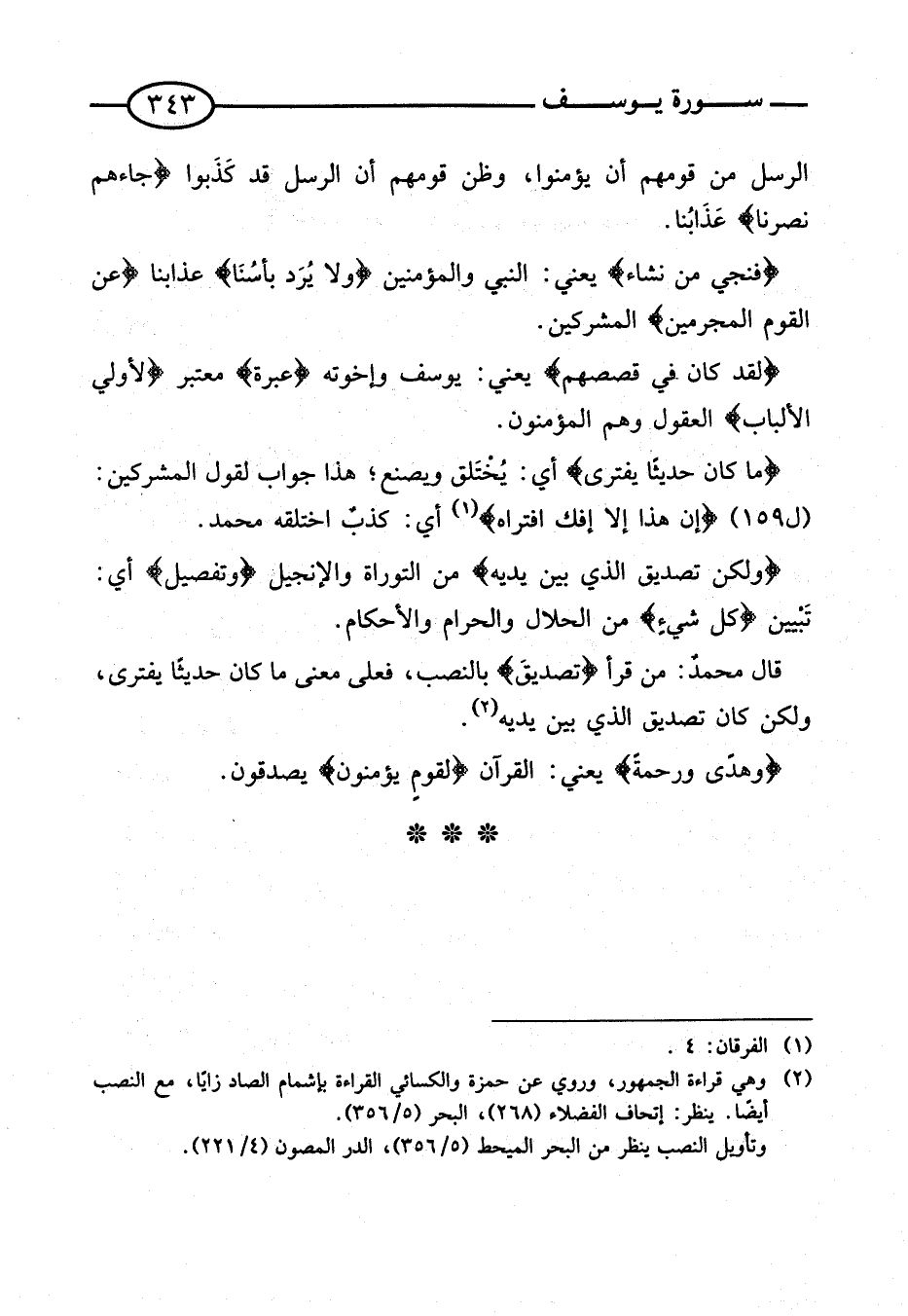 قَالَ محمدٌ: من قَرَأَ {تَصْدِيق} بِالنَّصْبِ، فَعَلَى مَعْنَى مَا كَانَ حَدِيثًا يُفْتَرَى، وَلَكِنْ كَانَ تَصْدِيقَ الَّذِي بَيْنَ يَدَيْهِ.