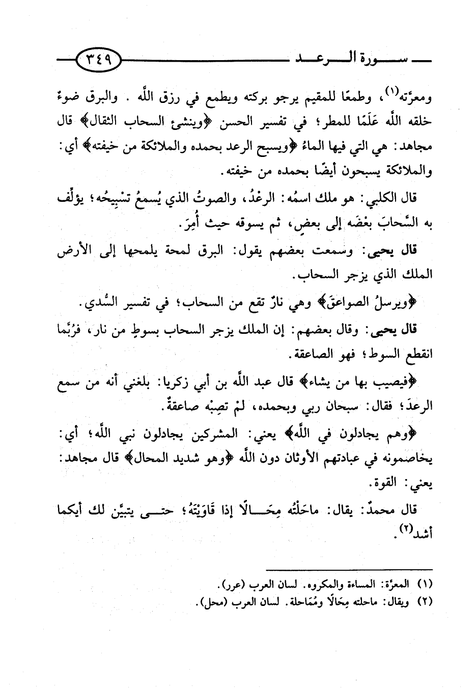 وَمَعَرَّتَهُ، وَطَمَعًا لِلْمُقِيمِ يَرْجُو بَرَكَتَهُ ويطمع فِيهِ رِزْقِ اللَّهِ. وَالْبَرْقُ ضوءٌ خَلَقَهُ اللَّهُ عَلَمًا لِلْمَطَرِ؛ فِي تَفْسِيرِ الْحسن {وينشئ السَّحَاب الثقال} قَالَ مُجَاهِدٌ: هِيَ الَّتِي فِيهَا المَاء