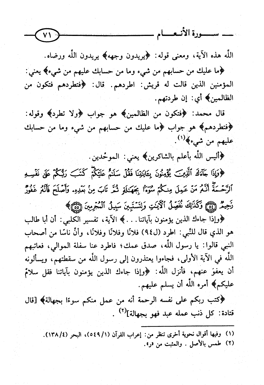 أَنَّ أَبَا طَالِبٍ هُوَ الَّذِي قَالَ لِلنَّبِيِّ: اطرد (ل 94) فُلَانًا وَفُلَانًا وَفُلَانًا، وَأَنَّ نَاسًا مِنْ أَصْحَابِ النَّبِيِّ قَالُوا: يَا رَسُولَ اللَّهِ، صَدَقَ عَمُّكَ؛ فَاطْرُدْ عَنَّا سَفَلَةَ الْمَوَالِي، فَعَاتَبَهُمُ اللَّهُ فِي الْآيَةِ الْأُولَى، فَجَاءُوا يَعْتَذِرُونَ إِلَى رَسُولِ اللَّهِ مِنْ سَقْطَتِهِمْ، وَيَسْأَلُونَهُ أَنْ يَعْفُوَ عَنْهُمْ، فَأَنْزَلَ اللَّهُ: {وَإِذَا جَاءَكَ الَّذِينَ يُؤْمِنُونَ بِآيَاتِنَا فَقل سَلام عَلَيْكُم} أَمَرَهُ اللَّهُ أَنْ يُسَلِّمَ عَلَيْهِمْ.