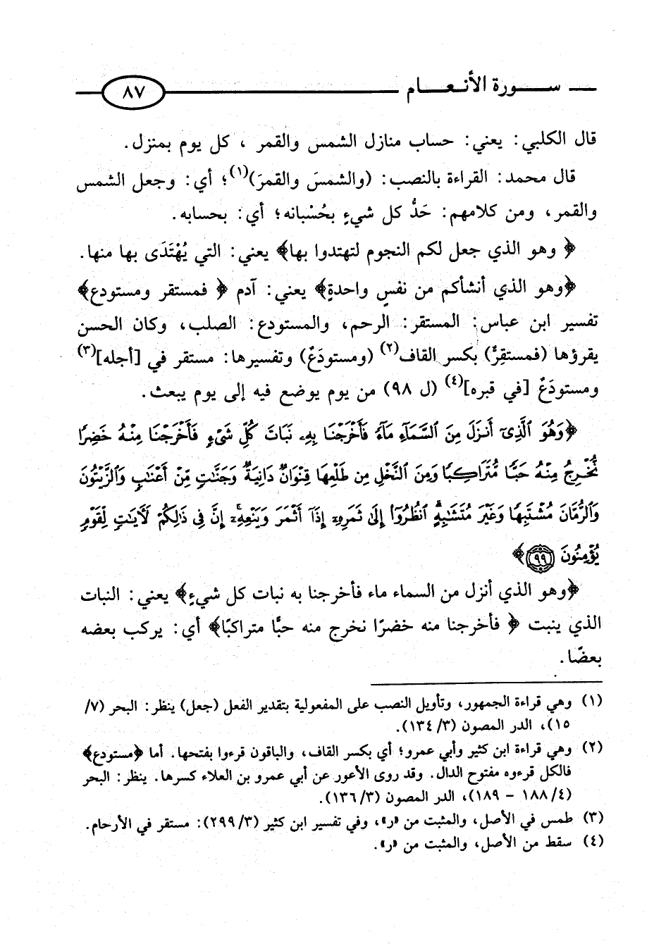 قَالَ مُحَمَّدٌ: الْقِرَاءَةُ بِالنَّصْبِ: (وَالشَّمْسَ وَالْقَمَر)؛ أَيْ: وَجَعَلَ الشَّمْسَ وَالْقَمَرَ، وَمِنْ كَلَامِهِمْ: حَدُّ كُلِّ شيءٍ بِحُسْبَانِهِ؛ أَي: بِحِسَابِهِ.