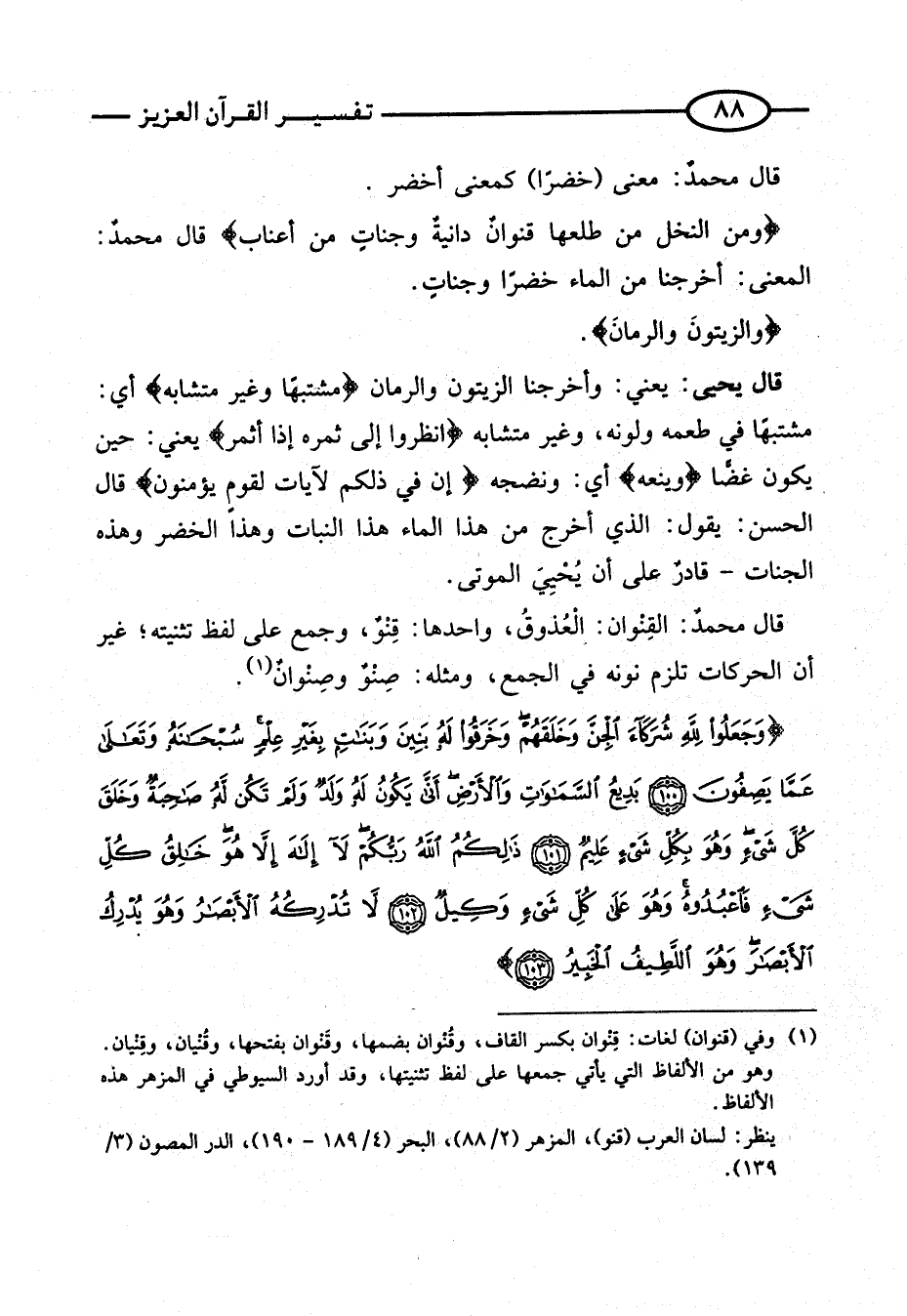قَالَ مُحَمَّدٌ: الْقِنْوَانُ: الْعُذُوقُ، وَاحِدُهَا: قِنْوٌ، وَجُمِعَ عَلَى لَفْظِ تَثْنِيَتِهِ؛ غَيْرَ أَنَّ الْحَرَكَاتِ تَلْزَمُ نُونَهُ فِي الْجمع، وَمثله: صنوٌ وصنوانٌ.