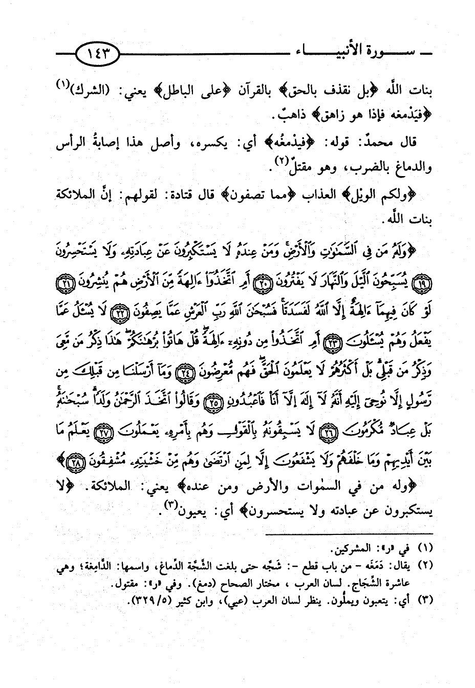 قَالَ مُحَمَّدٌ: قَوْلُهُ: {فَيَدْمَغُهُ} أَيْ: يَكْسِرُهُ، وَأَصْلُ هَذَا إِصَابَةُ الرَّأْسِ وَالدِّمَاغِ بِالضَّرْبِ، وَهُوَ مُقْتِلٌ. {وَلكم الويل} الْعَذَاب {مِمَّا تصفون} قَالَ قَتَادَةُ: لِقَوْلِهِمْ: إِنَّ الْمَلَائِكَةَ بَنَات الله.