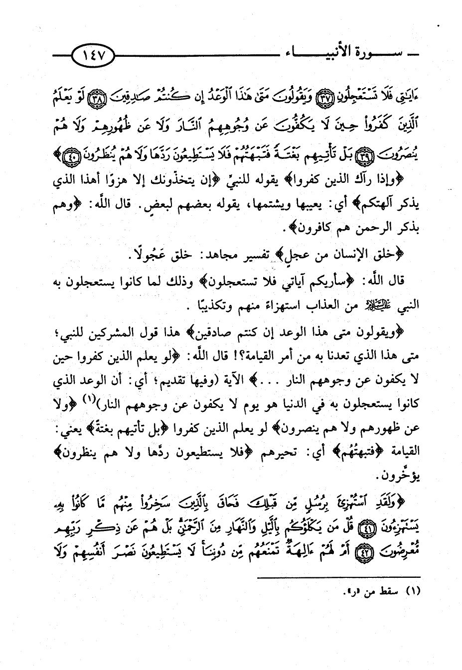 قَالَ اللَّهُ: {لَوْ يَعْلَمُ الَّذِينَ كَفَرُوا حِينَ لَا يَكُفُّونَ عَنْ وُجُوههم النَّار} الْآيَةُ (وَفِيهَا تَقْدِيمٌ؛ أَيْ: أَنَّ الْوَعْد الَّذِي كَانُوا يَسْتَعْجِلُونَ بِهِ فِي الدُّنْيَا هُوَ يَوْمُ لَا يَكُفُّونَ عَنْ وُجُوهِهِمُ النَّارَ) {وَلا عَنْ ظُهُورِهِمْ وَلا هم ينْصرُونَ} لَو يعلم الَّذين كفرُوا