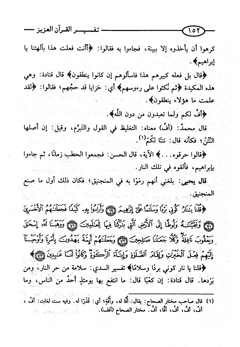 {قُلْنَا يَا نَارُ كُونِي بَرْدًا وَسلَامًا} تَفْسِيرُ السُّدِّيِّ: سَلَامَةً مِنْ حَرِّ النَّارِ، وَمِنْ بَرْدِهَا. قَالَ قَتَادَةُ: إِنَّ كَعْبًا قَالَ: مَا انْتَفَعَ بِهَا يَوْمَئِذٍ أَحَدٌ مِنَ النَّاسِ، وَمَا