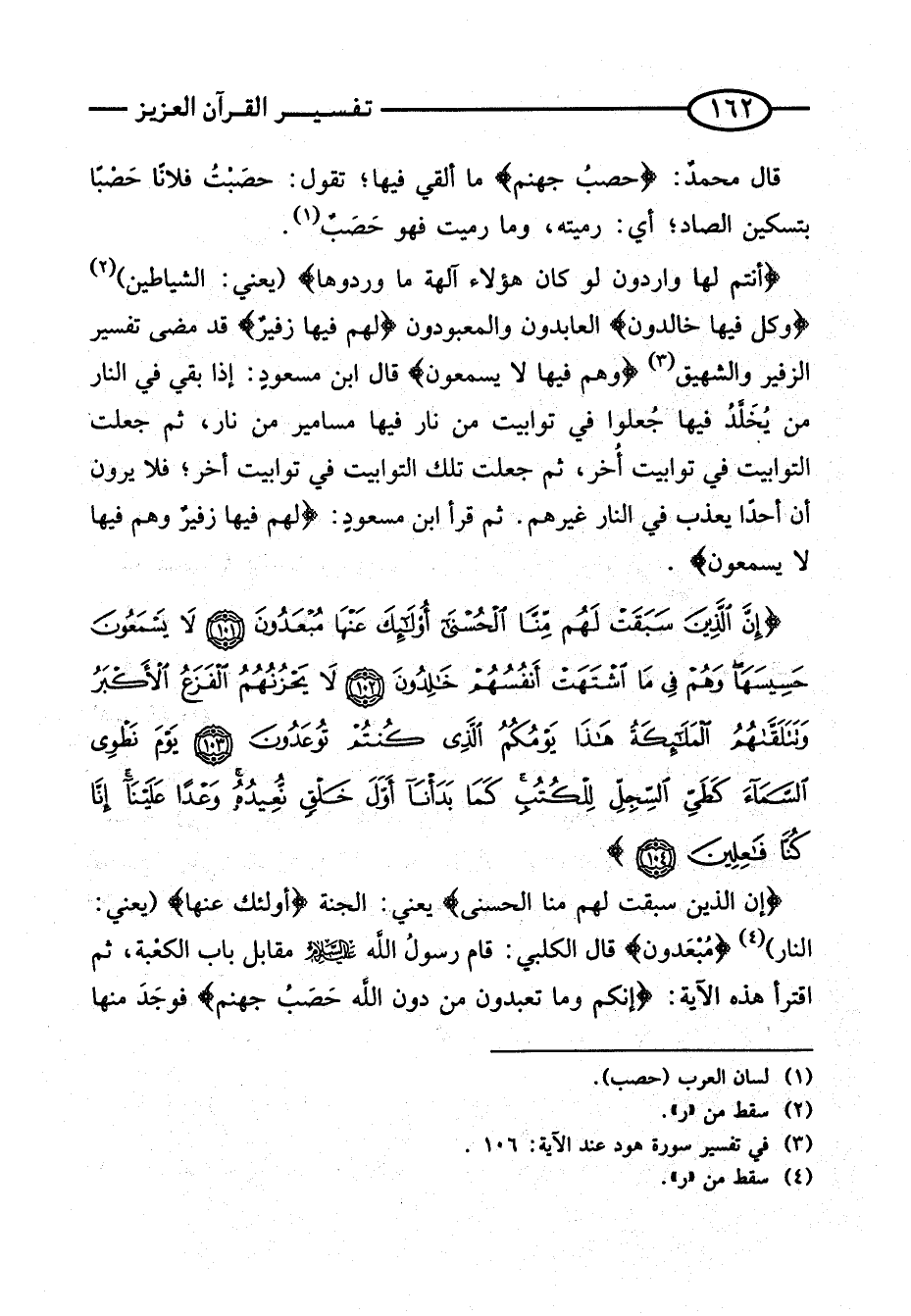 قَالَ مُحَمَّد: {حصب جَهَنَّم} مَا أُلْقِي فِيهَا؛ تَقُولُ: حَصَبْتُ فُلَانًا حَصْبًا بِتَسْكِينِ الصَّادِ؛ أَيْ: رَمَيْتُهُ، وَمَا رَمَيْتَ فَهُوَ حَصَبٌ. {أَنْتُمْ لَهَا وَارِدُونَ لَوْ كَانَ هَؤُلَاءِ آلِهَة مَا وردوها} (يَعْنِي: الشَّيَاطِينَ) {وَكُلٌّ فِيهَا خَالِدُونَ} العابدون والمعبودون