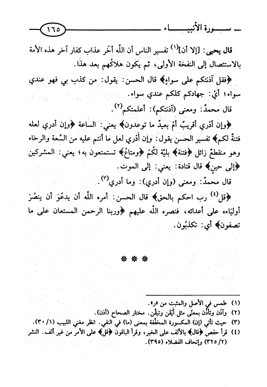 قَالَ مُحَمَّد: وَمعنى (آذنتكم): أَعْلَمْتُكُمْ. {وَإِنْ أَدْرِي أَقَرِيبٌ أَمْ بعيد مَا توعدون} يَعْنِي: السَّاعَة