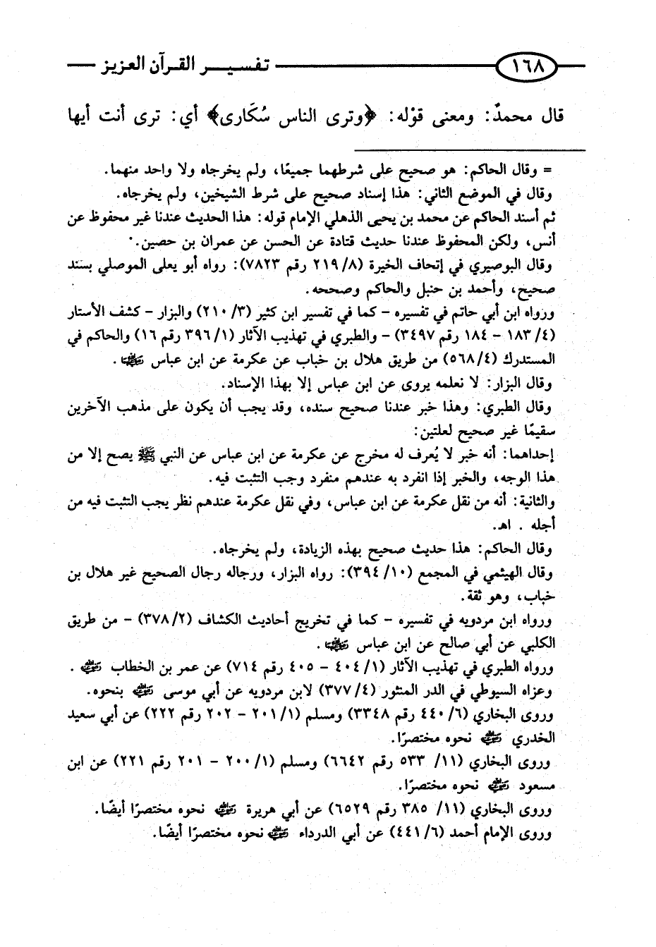 قَالَ مُحَمَّدٌ: وَمَعْنَى قَوْلِهِ: {وَتَرَى النَّاس سكارى} أَيْ: تَرَى أَنْتَ أَيُّهَا