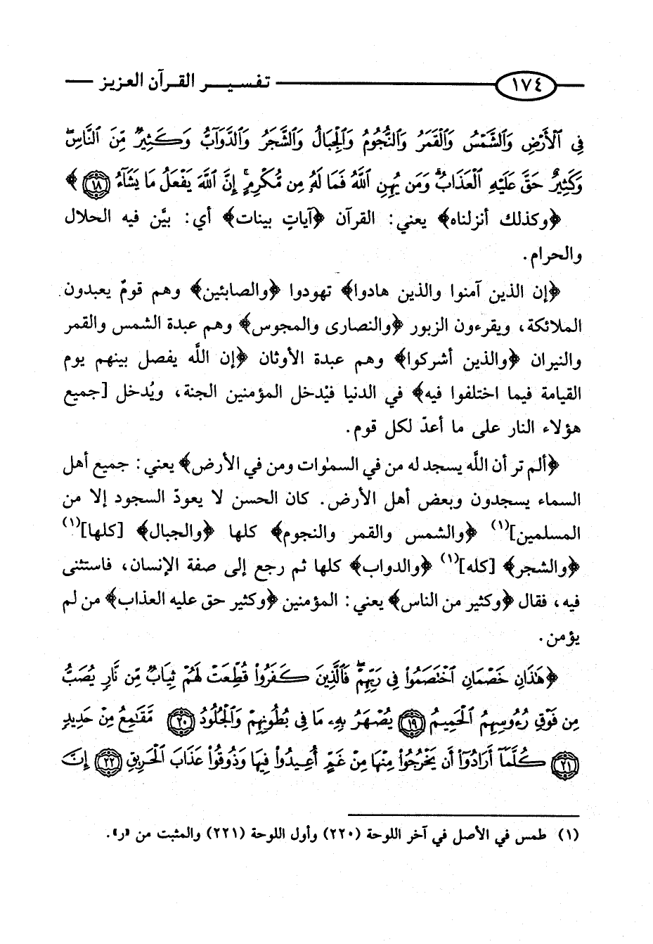{أَلَمْ تَرَ أَنَّ اللَّهَ يَسْجُدُ لَهُ مَنْ فِي السَّمَاوَاتِ وَمَنْ فِي الأَرْض} يَعْنِي: جَمِيعَ أَهْلِ السَّمَاءِ يَسْجُدُونَ وَبَعْضُ أَهْلِ الْأَرْضِ. كَانَ الْحَسَنُ لَا يُعَوِّدُ السُّجُودَ إِلَّا مِنَ الْمُسلمين] {وَالشَّمْس وَالْقَمَر والنجوم} كلهَا {وَالْجِبَال} [كلهَا] {وَالشَّجر} [كُله] {وَالدَّوَاب} كُلُّهَا ثُمَّ رَجَعَ إِلَى صِفَةِ الْإِنْسَانِ، فَاسْتَثْنَى فِيهِ، فَقَالَ {وَكَثِيرٌ من النَّاس} يَعْنِي: الْمُؤْمِنِينَ {وَكَثِيرٌ حَقَّ عَلَيْهِ الْعَذَاب} من لم يُؤمن.