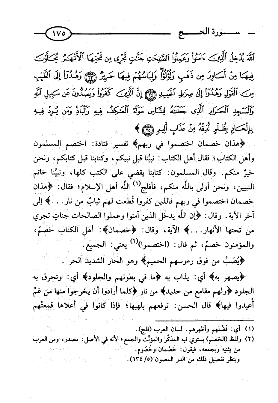 {هَذَانِ خَصْمَانِ اخْتَصَمُوا فِي رَبِّهِمْ} تَفْسِيرُ قَتَادَةَ: اخْتَصَمَ الْمُسْلِمُونَ وَأَهْلُ الْكِتَابِ؛ فَقَالَ أَهْلُ الْكِتَابِ: نَبِيُّنَا قَبْلَ نَبِيِّكُمْ، وَكِتَابُنَا قَبْلَ كِتَابِكُمْ، وَنَحْنُ خَيْرٌ مِنْكُمْ. وَقَالَ الْمُسْلِمُونَ: كِتَابُنَا يَقْضِي عَلَى الْكُتُبِ كُلِّهَا، وَنَبِيُّنَا خَاتَمُ النَّبِيِّينَ، وَنَحْنُ أَوْلَى بِاللَّهِ مِنْكُمْ، فَأْفَلَجَ اللَّهُ أَهْلَ الْإِسْلَامِ؛ فَقَالَ: {هَذَانِ خَصْمَانِ اخْتَصَمُوا فِي رَبِّهِمْ فَالَّذِينَ كَفَرُوا قُطِّعَتْ لَهُم ثِيَاب من نَار} إِلَى آخِرِ الْآيَةِ. وَقَالَ {إِنَّ اللَّهَ يُدْخِلُ الَّذِينَ آمَنُوا وَعَمِلُوا الصَّالِحَاتِ جَنَّاتٍ تَجْرِي مِنْ تَحْتِهَا الْأَنْهَار} الْآيَة، وَقَالَ: {خصمان}: أَهْلُ الْكِتَابِ خَصْمٌ، وَالْمُؤْمِنُونَ خَصْمٌ، ثمَّ قَالَ: (اخْتَصَمُوا) يَعْنِي: الْجَمِيع. {وَيصب من فَوق رُءُوسهم الْحَمِيم} وَهُوَ الْحَار الشَّديد الْحر.