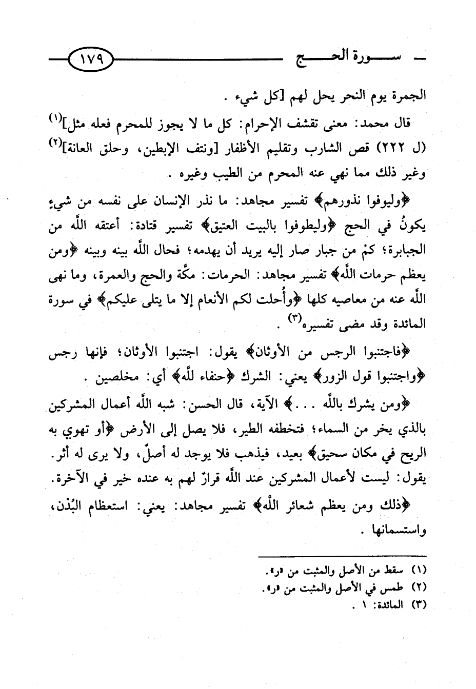 {وَمن يعظم حرمات الله} تَفْسِيرُ مُجَاهِدٍ: الْحُرُمَاتُ: مَكَّةُ وَالْحَجُّ وَالْعُمْرَةُ، وَمَا نَهَى اللَّهُ عَنْهُ مِنْ مَعَاصِيهِ كُلِّهَا {وَأُحِلَّتْ لَكُمُ الأَنْعَامُ إِلا مَا يُتْلَى عَلَيْكُمْ} فِي سُورَةِ الْمَائِدَةِ وَقَدْ مَضَى تَفْسِيره. {فَاجْتَنبُوهُ الرجس من الْأَوْثَان} يَقُولُ: اجْتَنِبُوا الْأَوْثَانَ؛ فَإِنَّهَا رِجْسٌ {وَاجْتَنبُوا قَول الزُّور} يَعْنِي: الشّرك {حنفَاء لله} أَي: مُخلصين.
