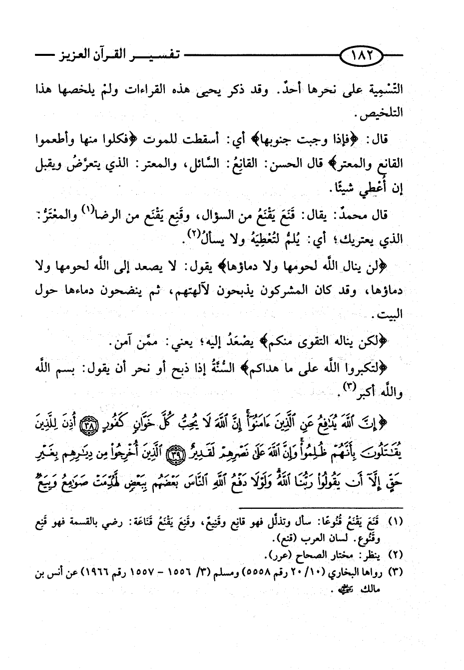 قَالَ: {فَإِذَا وَجَبت جنوبها} أَي: أسقطت لِلْمَوْتِ {فَكُلُوا مِنْهَا وَأَطْعِمُوا الْقَانِعَ والمعتر} قَالَ الْحَسَنُ: الْقَانِعُ: السَّائِلُ، وَالْمُعْتَرُّ: الَّذِي يَتَعَرَّضُ وَيُقْبِلُ إِنْ أُعْطِي شَيْئًا.