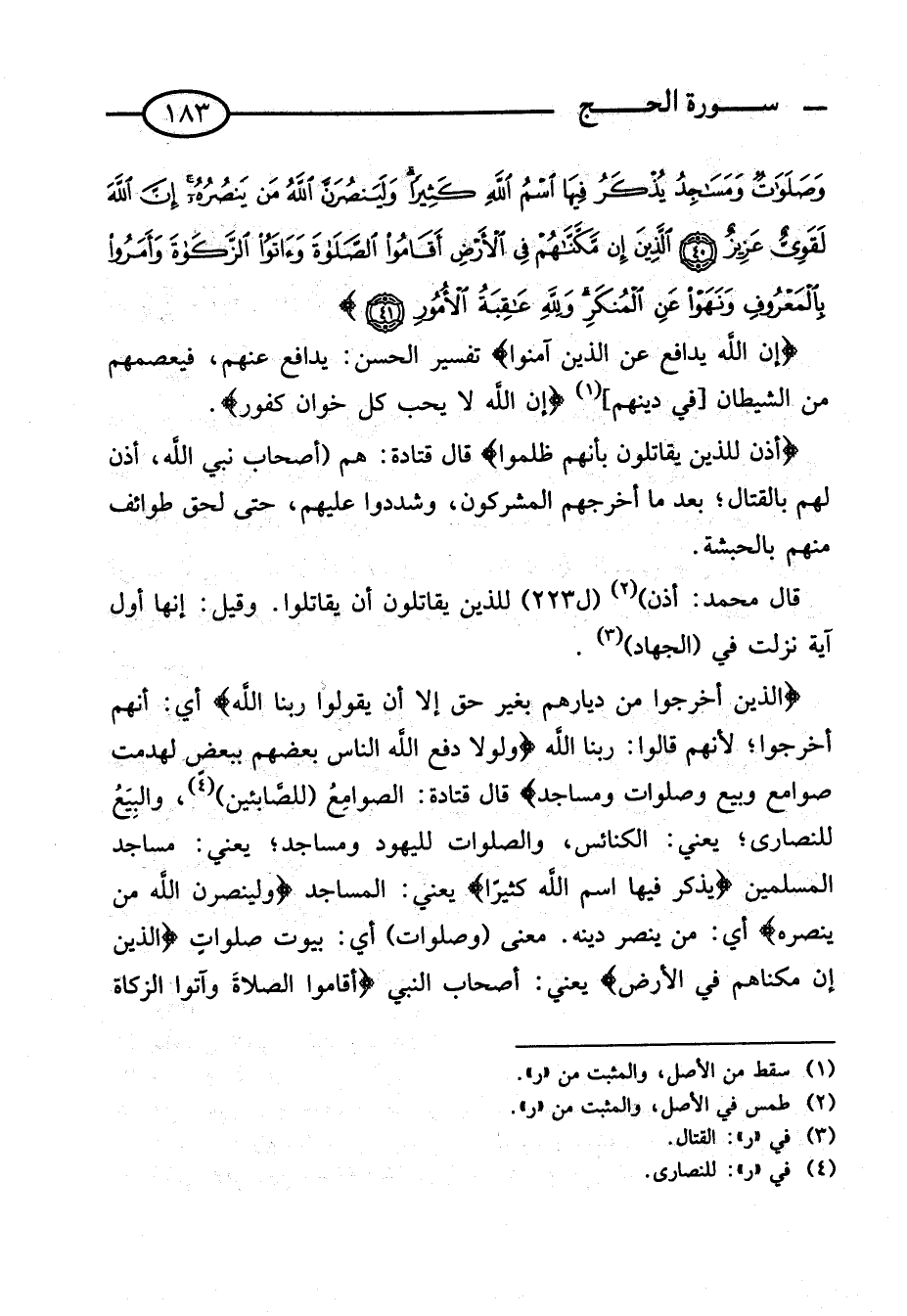 {الَّذِينَ أُخْرِجُوا مِنْ دِيَارِهِمْ بِغَيْرِ حَقٍّ إِلا أَنْ يَقُولُوا رَبُّنَا الله} أَيْ: أَنَّهُمْ أُخْرِجُوا؛ لِأَنَّهُمْ قَالُوا: رَبُّنَا اللَّهُ {وَلَوْلا دَفْعُ اللَّهِ النَّاسَ بَعْضَهُمْ بِبَعْضٍ لَهُدِّمَتْ صَوَامِعُ وَبيع وصلوات ومساجد} قَالَ قَتَادَةُ: الْصَوَامِعُ (لِلصَّابِئِينَ)، وَالْبِيَعُ لِلنَّصَارَى؛ يَعْنِي: الْكَنَائِسَ، وَالصَّلَوَاتُ لِلْيَهُودُ وَمَسَاجِدَ؛ يَعْنِي: مَسَاجِدَ الْمُسْلِمِينَ {يُذْكَرُ فِيهَا اسْم الله كثيرا} يَعْنِي: الْمَسَاجِدَ {وَلَيَنْصُرَنَّ اللَّهُ مَنْ ينصره} أَيْ: مَنْ يَنْصُرُ دِينَهُ. مَعْنَى (وصلوات) أَي: بيُوت صلوَات